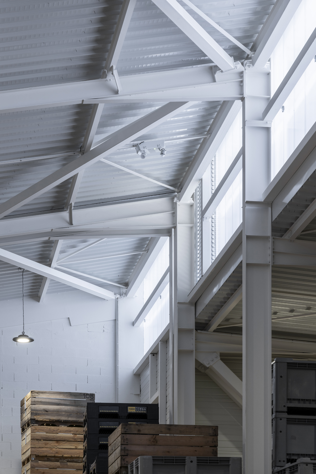 Le projet contient l’ensemble du programme en un seul volume simple, implanté sur la partie la plus large du site (à l’Ouest) et en limite de parcelle afin d’offrir des volumes de stockages intérieurs aux proportions optimales. Posé sur un socle en béton pour respecter la côte d’inondabilité, il est « creusé » aux deux extrémités pour couvrir les zones de livraisons et expéditions des véhicules. En son centre, la toiture se soulève pour apporter de la lumière zénithale à travers le shed dans les zones de convivialité, de stockage et de travail. Également, une large baie éclaire une zone de travail très utilisée par les bénévoles et quelques percements à l’étage sur les bureaux se fondent dans la masse derrière un bardage perforé. Ce projet s’appuie sur une volonté d’utiliser des matériaux pérennes et faciles d’entretien en accord avec les capacités de l’association et, dans la mesure du possible, locaux. Contrairement aux bâtiments de stockage traditionnels, par le système constructif mis en œuvre, sa forme compacte et la position d’ouvertures au Nord, le projet permet de garantir une isolation continue de l’ensemble du volume et de limiter les déperditions thermiques. Cette configuration favorise un confort de travail pour les bénévoles été comme hiver, une économie des coûts d’exploitation et de maintenance, le respect des règlementations environnementales pour la partie bureaux et un usage des halles à température ambiante.