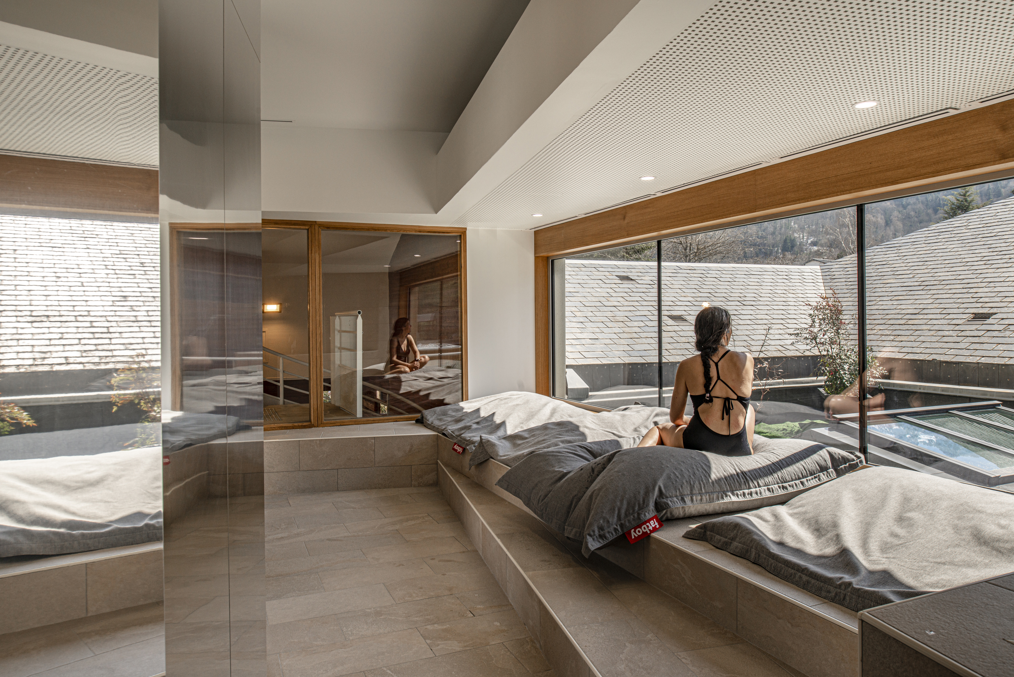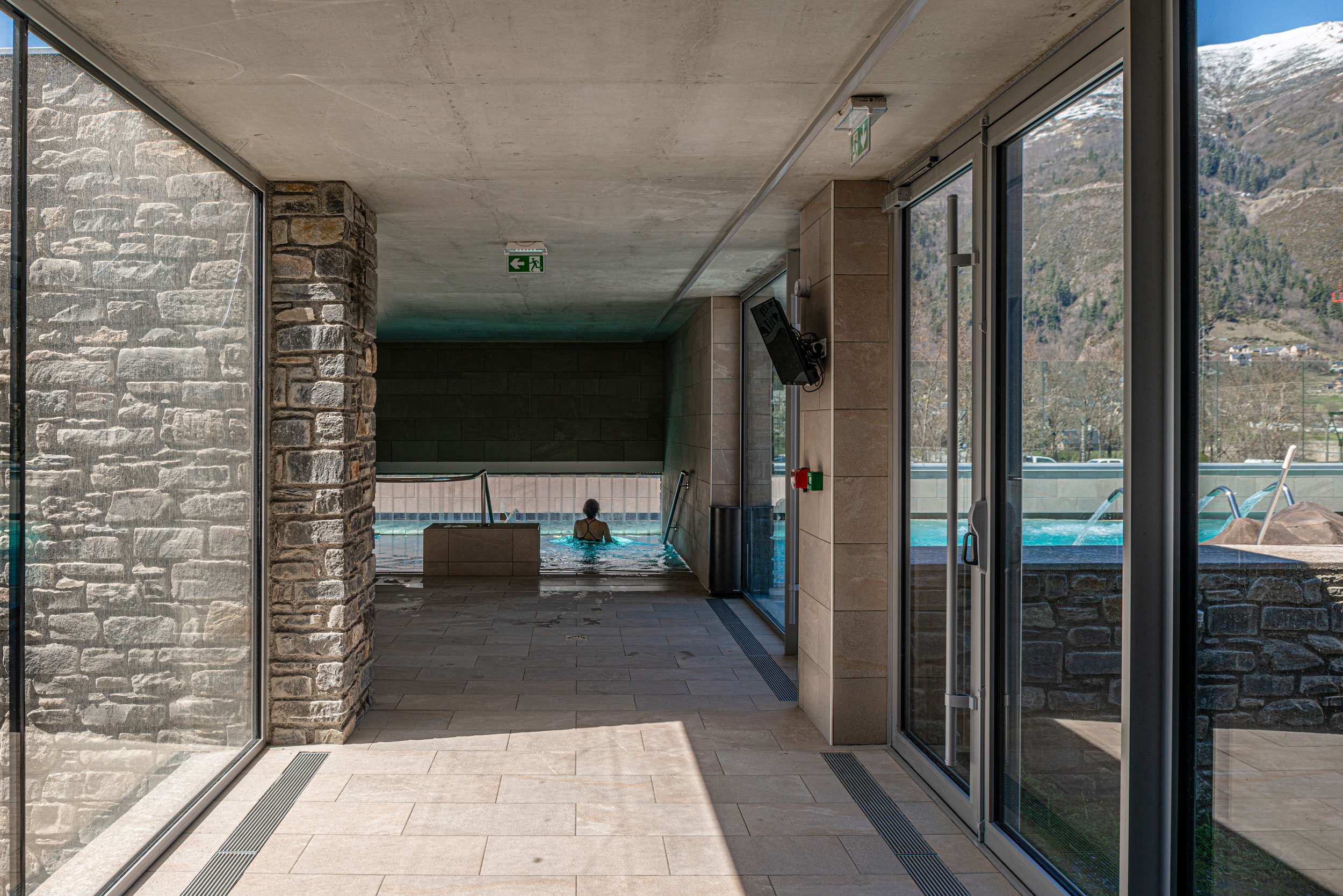 Le centre thermoludique « Le RIO » de Saint Lary Soulan s’inscrit dans un ensemble architectural composé d’un hôtel, des thermes et du RIO : Le complexe SENSORIA. Le programme porte sur la modernisation et l’extension du RIO dans le but d’offrir à la clientèle une nouvelle offre. Le projet propose un nouveau service d’accueil, une nouvelle offre de spa, et des bassins extérieurs. Le spa est aménagé à l’étage autour de la salle de chromothérapie. Cet espace est composé d’un hammam constitué de trois pièces successives à températures croissantes (38°à 48°), d’une douche en eau froide et une douche en eau chaude, un coin tisanerie, la salle de repos basée sur la chromothérapie et une terrasse extérieure avec un jacuzzi de 6-8 places. Les bassins extérieurs sont positionnés face aux montagnes et tente de faire disparaitre le parking du premier plan par des jeux de cadrage des vues.