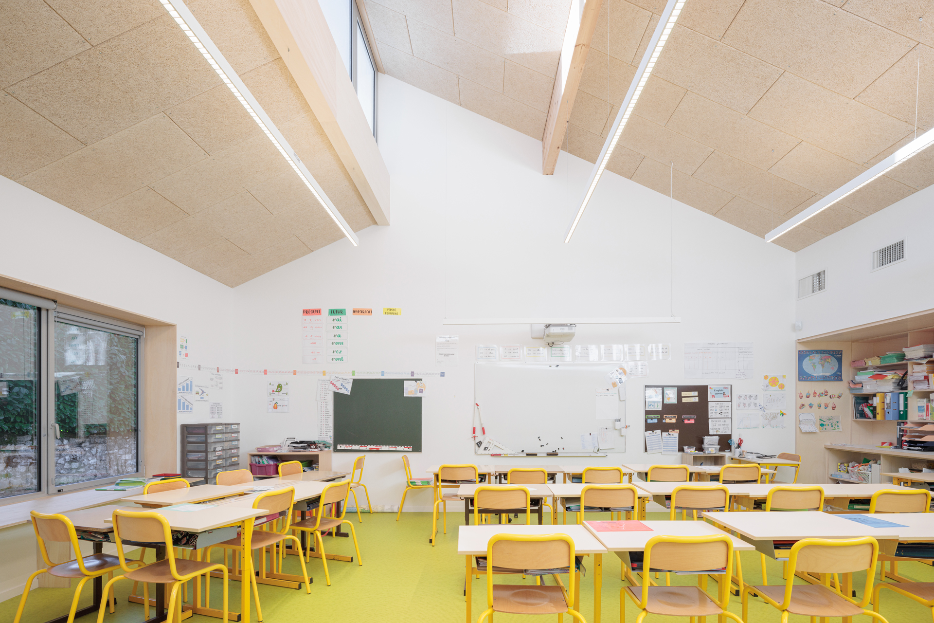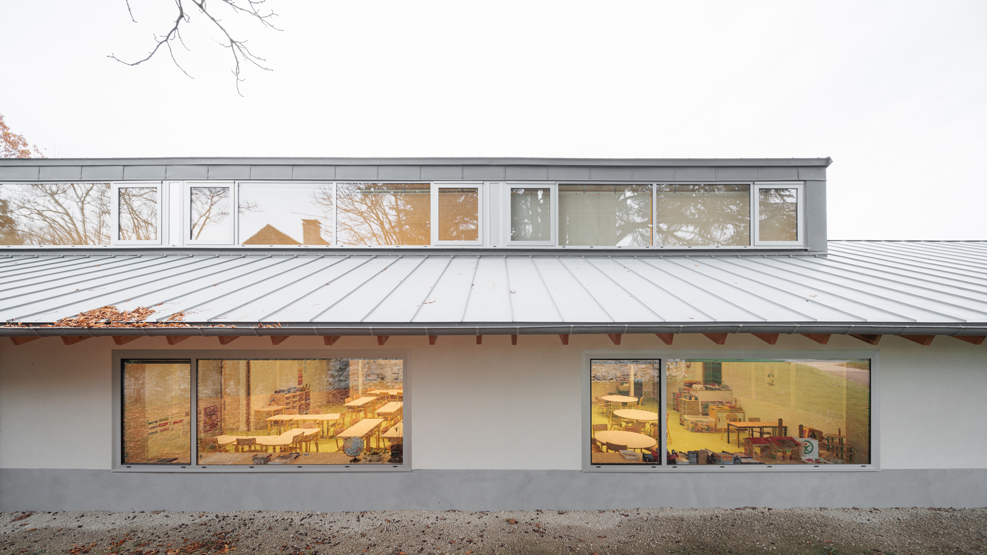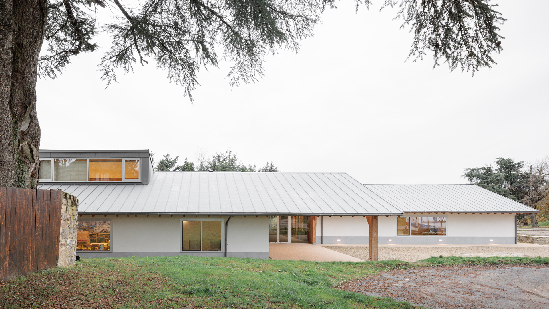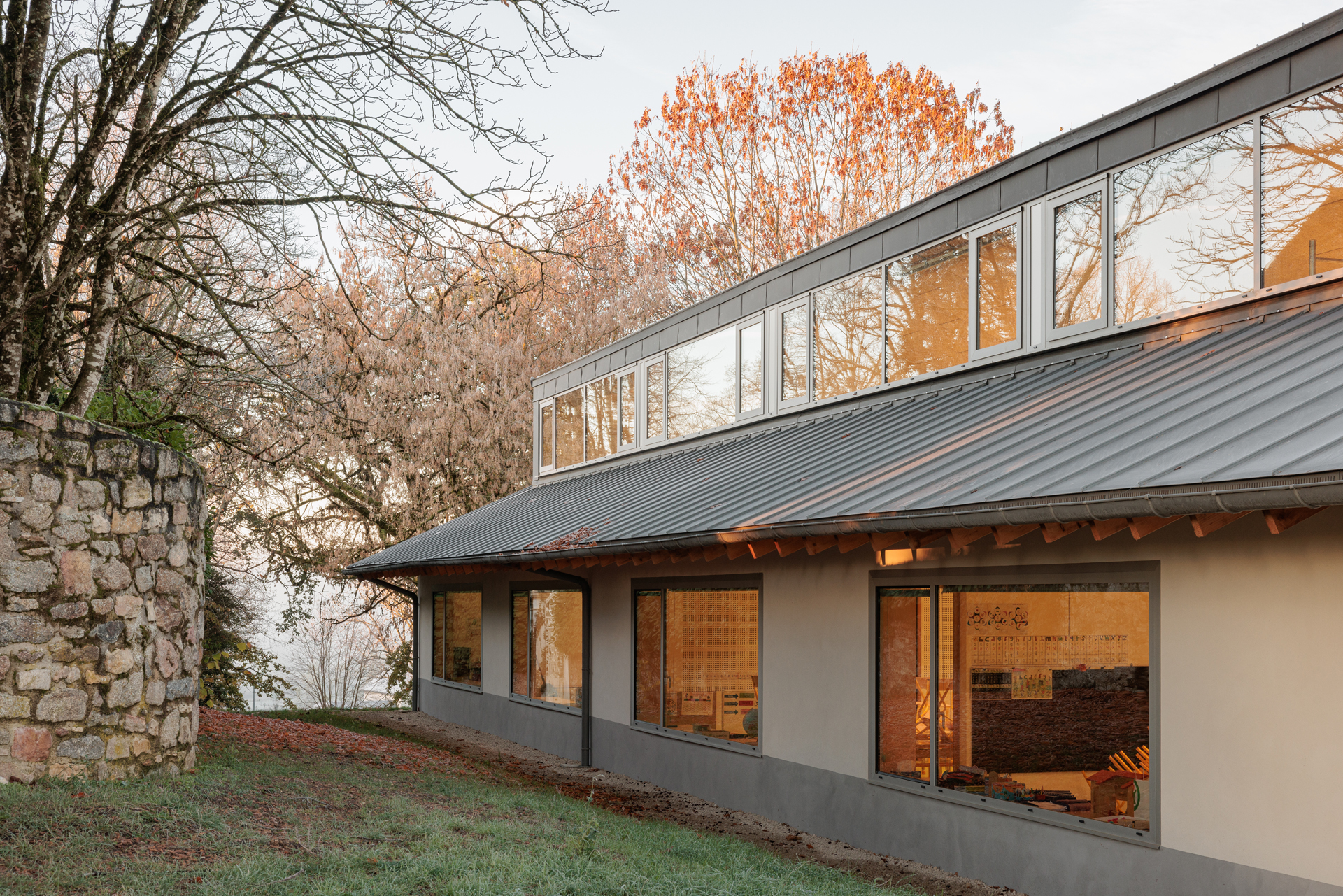 Le site choisi présente de très nombreuses qualités : clairière entourée d’arbres majestueux, vues dégagés au sud, accès facile et protégé en partie Nord... L’enjeu principal du projet est donc d’intégrer l’école dans ce site remarquable sans en dénaturer le caractère. Notre proposition s’appuie donc sur les composantes paysagères du site pour les valoriser et les conserver. Notre réponse architecturale et paysagère se construit sur la base de 3 principes forts : • Un bâti implanté en bordure Est du site pour protéger la maison voisine des nuisances de la cour et proposer une école clairière ouverte sur le paysage • Une architecture de toits faisant référence aux constructions vernaculaires locales • Une structure paysagère existante mise en valeur.