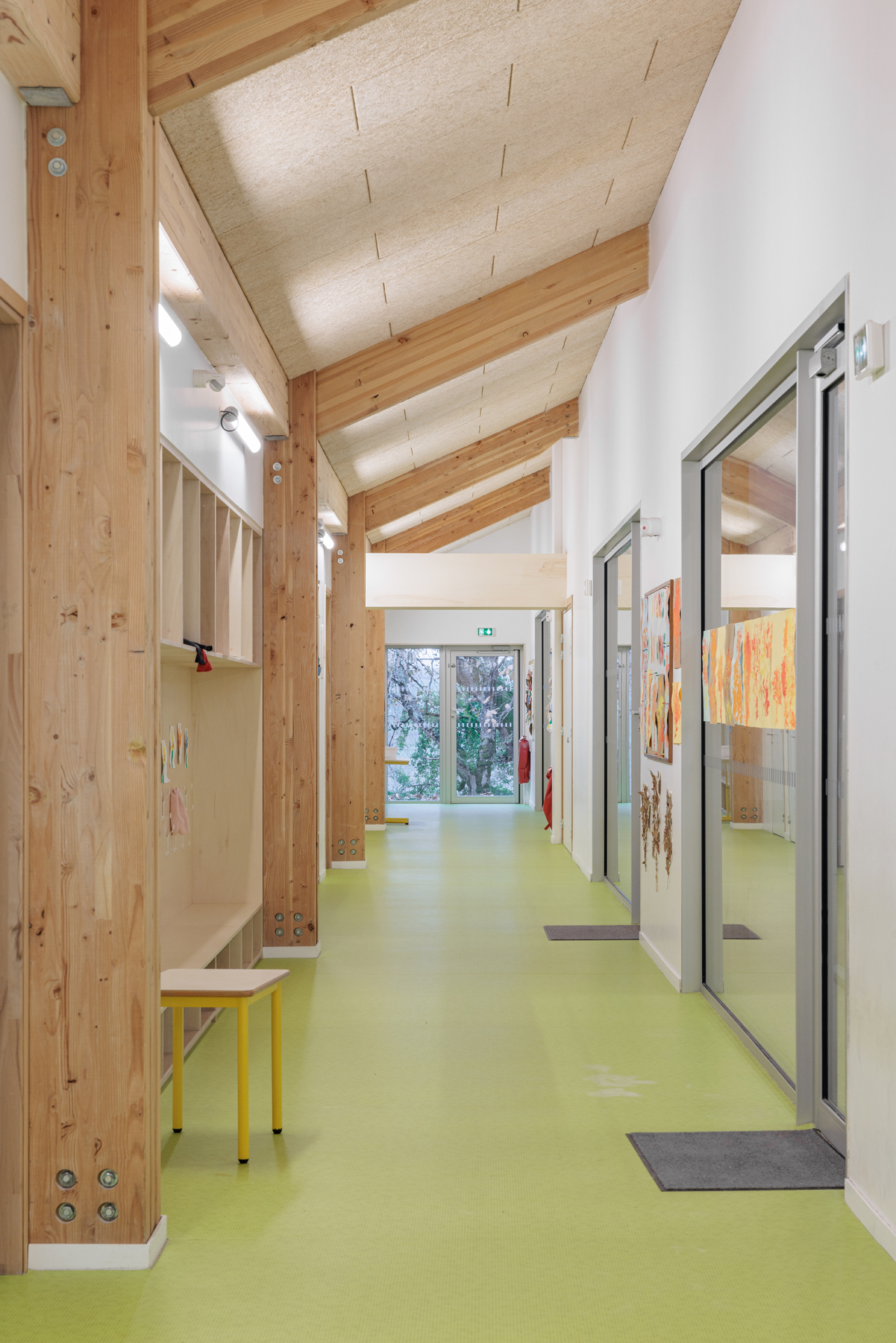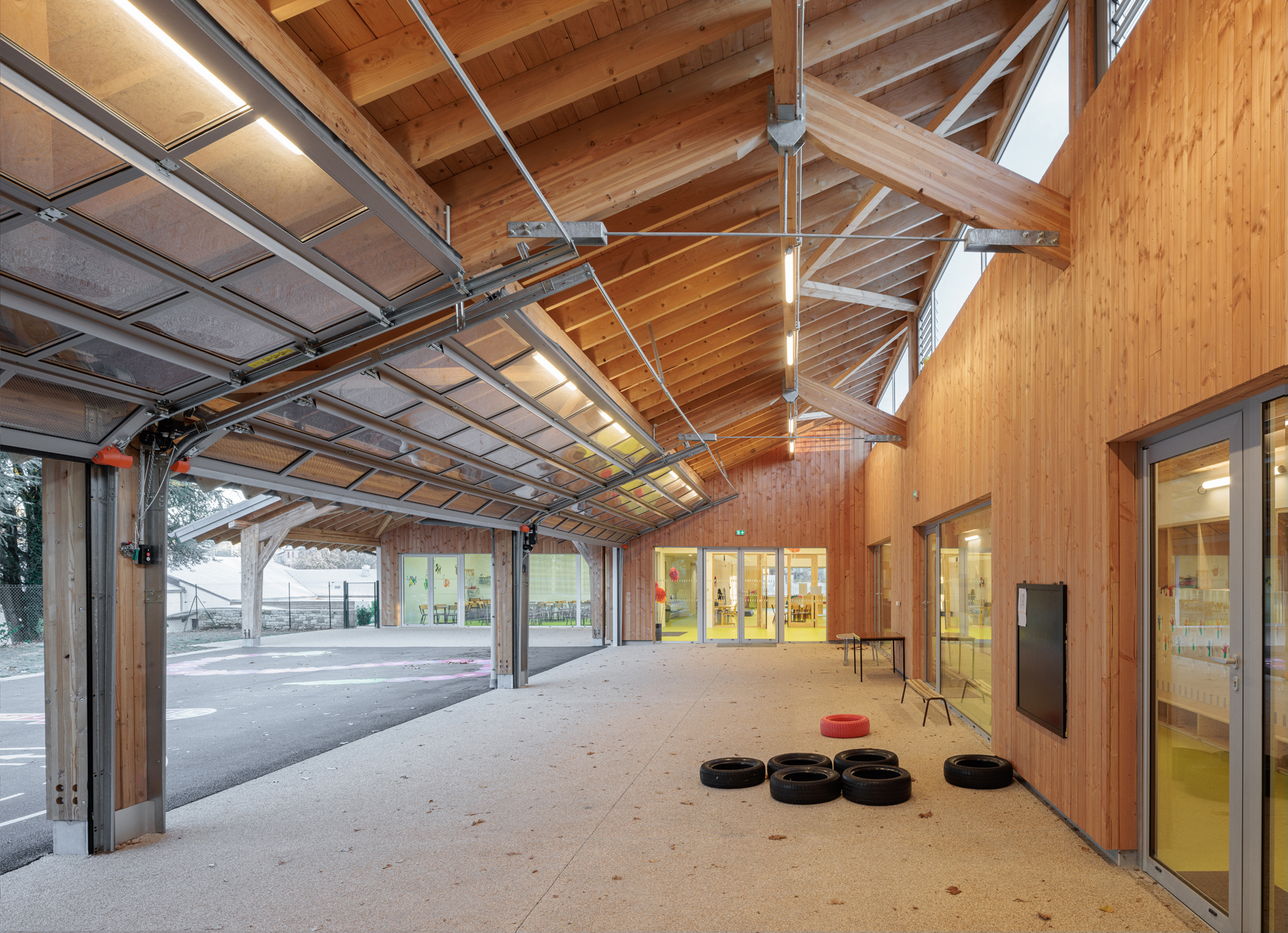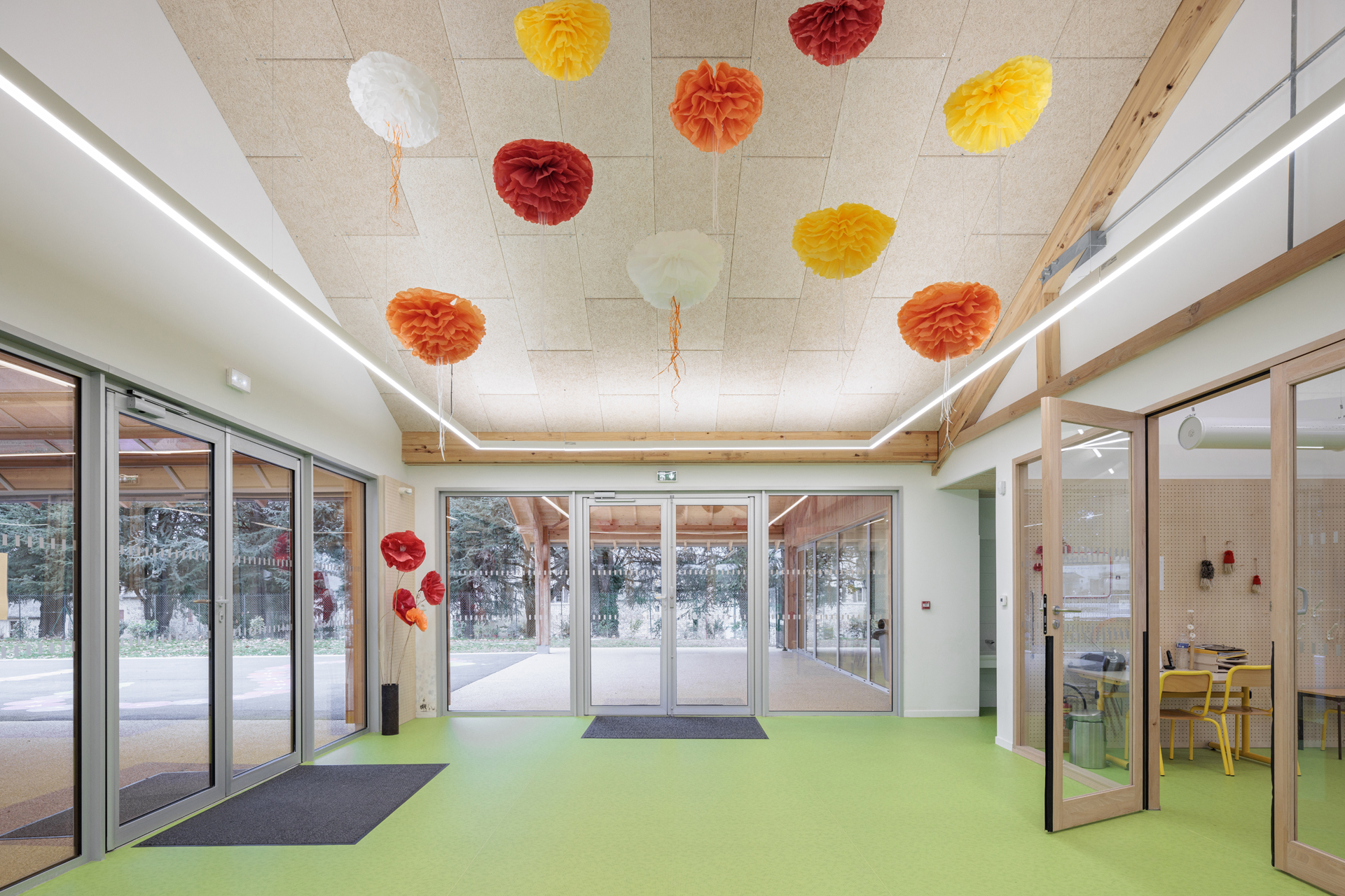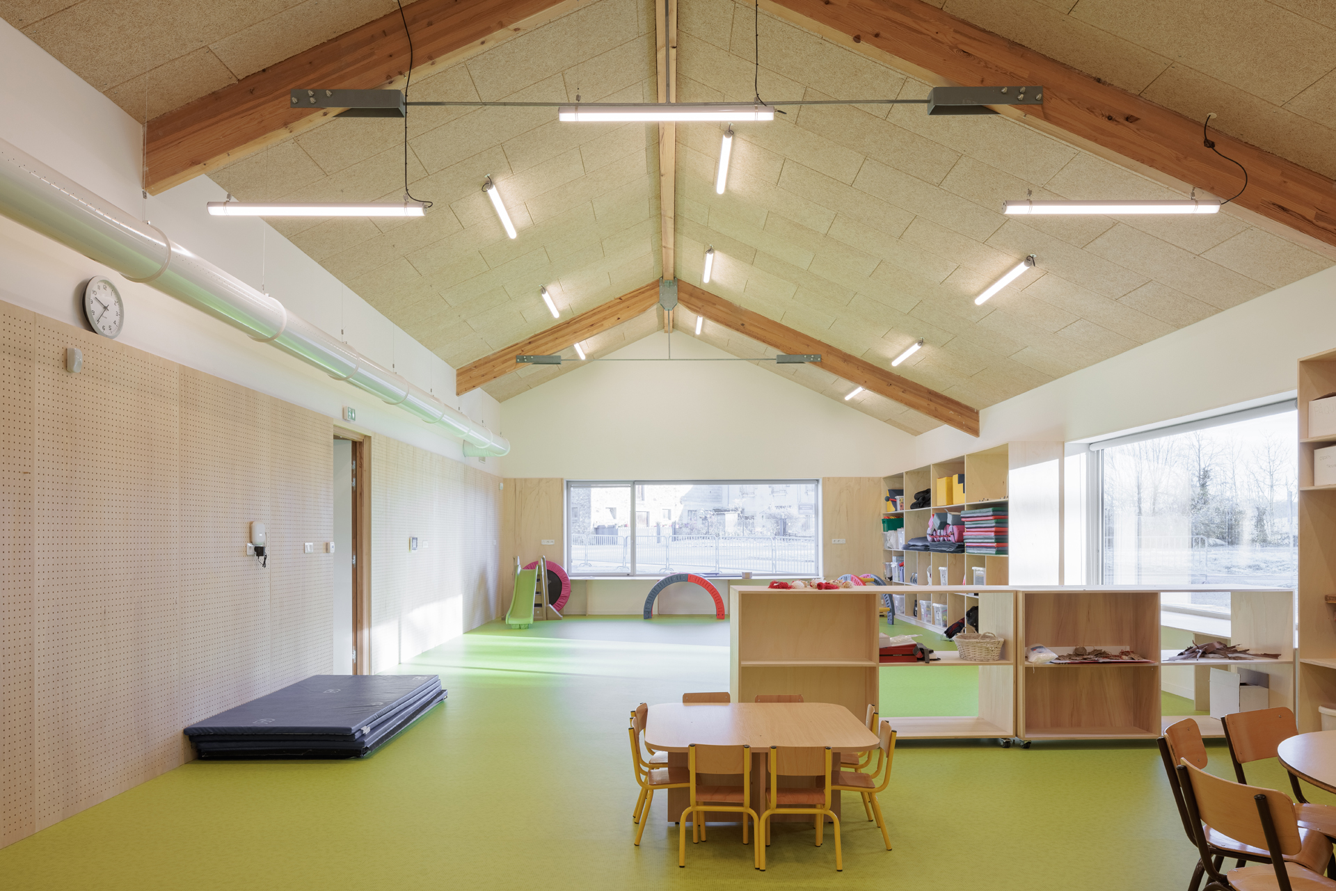 Le site choisi présente de très nombreuses qualités : clairière entourée d’arbres majestueux, vues dégagés au sud, accès facile et protégé en partie Nord... L’enjeu principal du projet est donc d’intégrer l’école dans ce site remarquable sans en dénaturer le caractère. Notre proposition s’appuie donc sur les composantes paysagères du site pour les valoriser et les conserver. Notre réponse architecturale et paysagère se construit sur la base de 3 principes forts : • Un bâti implanté en bordure Est du site pour protéger la maison voisine des nuisances de la cour et proposer une école clairière ouverte sur le paysage • Une architecture de toits faisant référence aux constructions vernaculaires locales • Une structure paysagère existante mise en valeur.