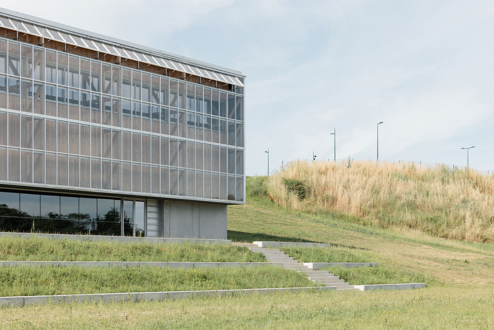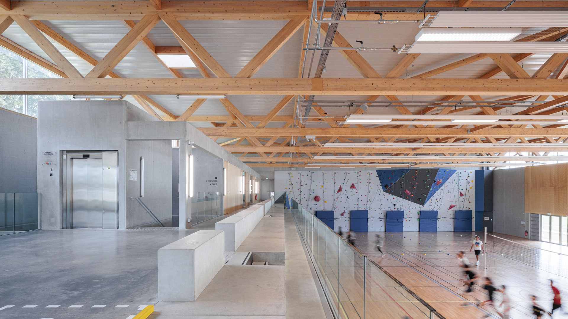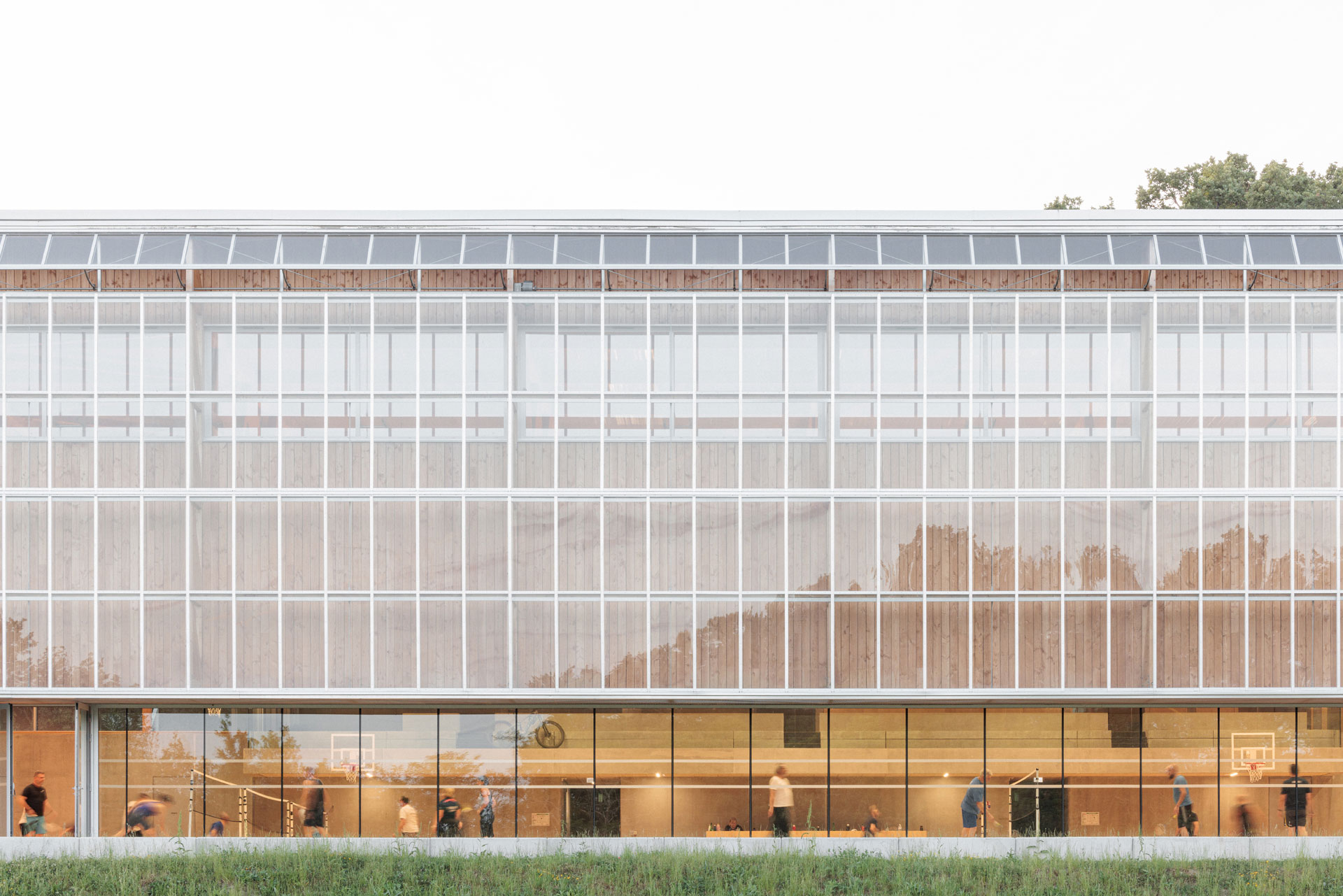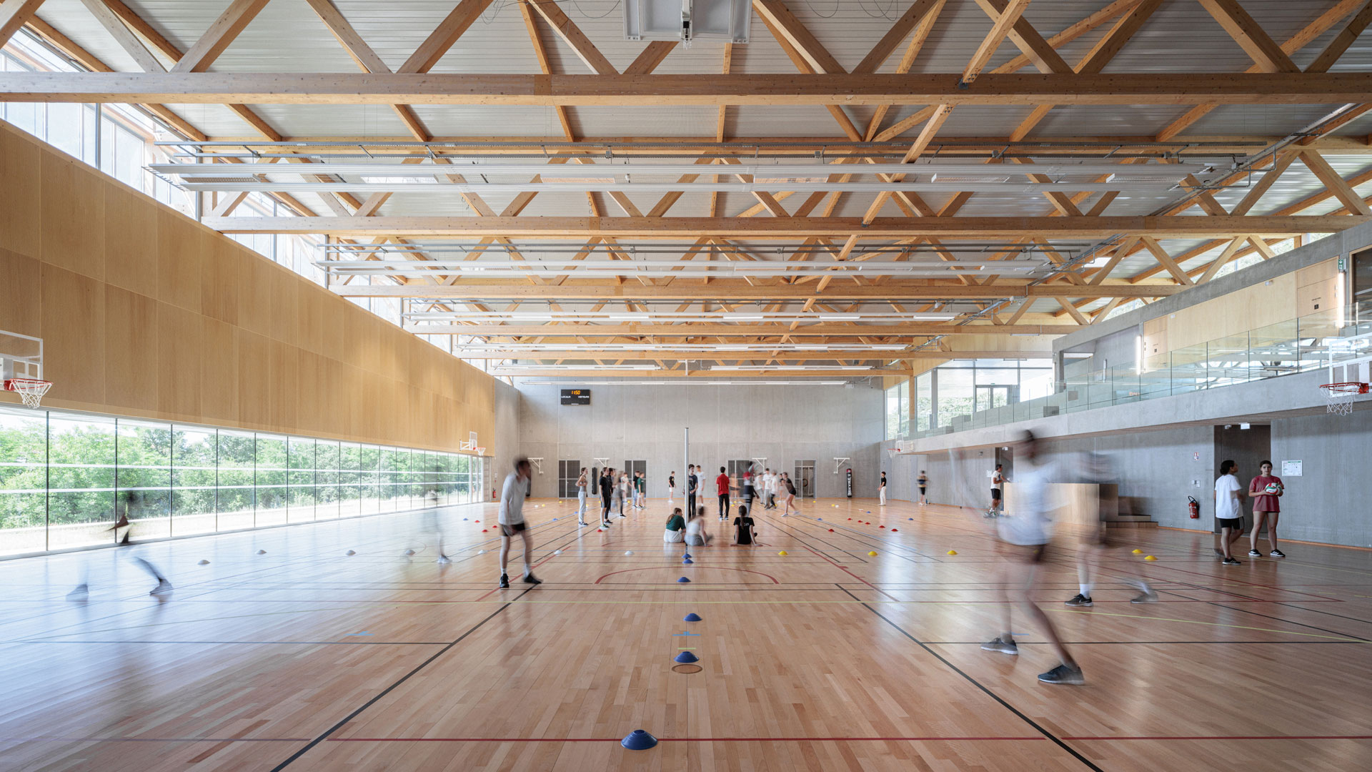Le nouveau gymnase d’Escalquens, connecté au nouveau collège, propose une offre sportive qualitative aussi bien pour les élèves que la population locale. L'intégration semi-enterrée du bâtiment permet à la fois de respecter le site existant et de produire un ensemble cohérent avec son environnement. Le projet vient ainsi s’implanter sur la plateforme existante pour proposer un ensemble compact et fonctionnel. Cette déclivité naturelle du terrain nous a permis de proposer une entrée haute, donnant au complexe une façade urbaine ouverte sur la ville. L'entrée principale à mi-hauteur permet donc un accès direct et simple depuis le collège et donne à l’ensemble son identité d’équipement public. Ce projet illustre notre engagement "low-tech", par le réemploi des énergies existante. C'est la première de nos réalisations à proposer une façade pariétodynamique : l’énergie solaire captée par la grande façade vitrée au Sud permet, grâce au principe d’effet de serre de chauffer de l’air qui sera ensuite envoyé dans le bâtiment. Cette façade est ensuite ventilée pour éviter la surchauffe. Cette proposition confère alors au bâtiment son image architecturale, sans nécessité de gestion ou d’entretien particulier.