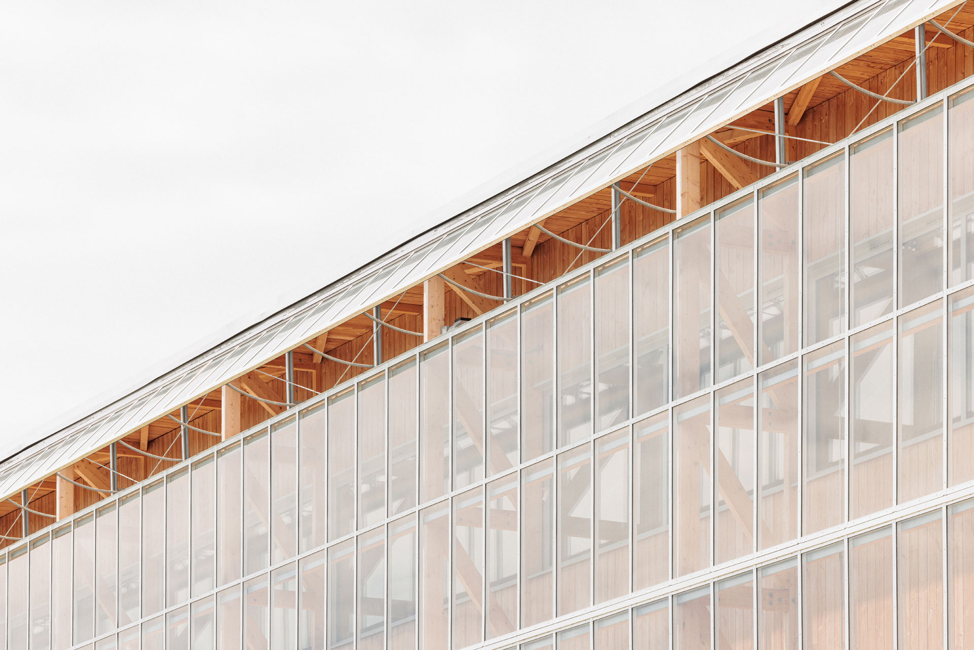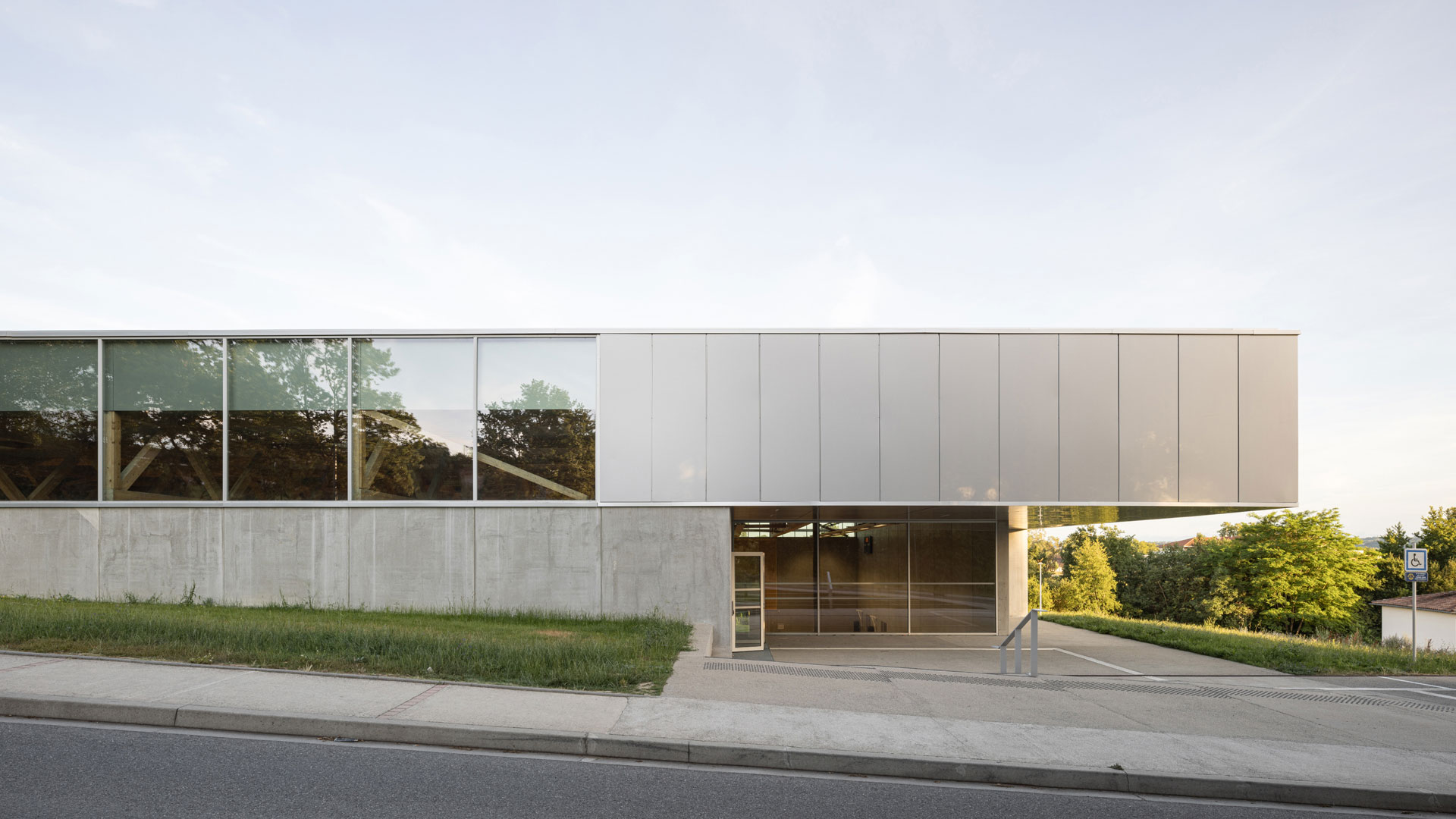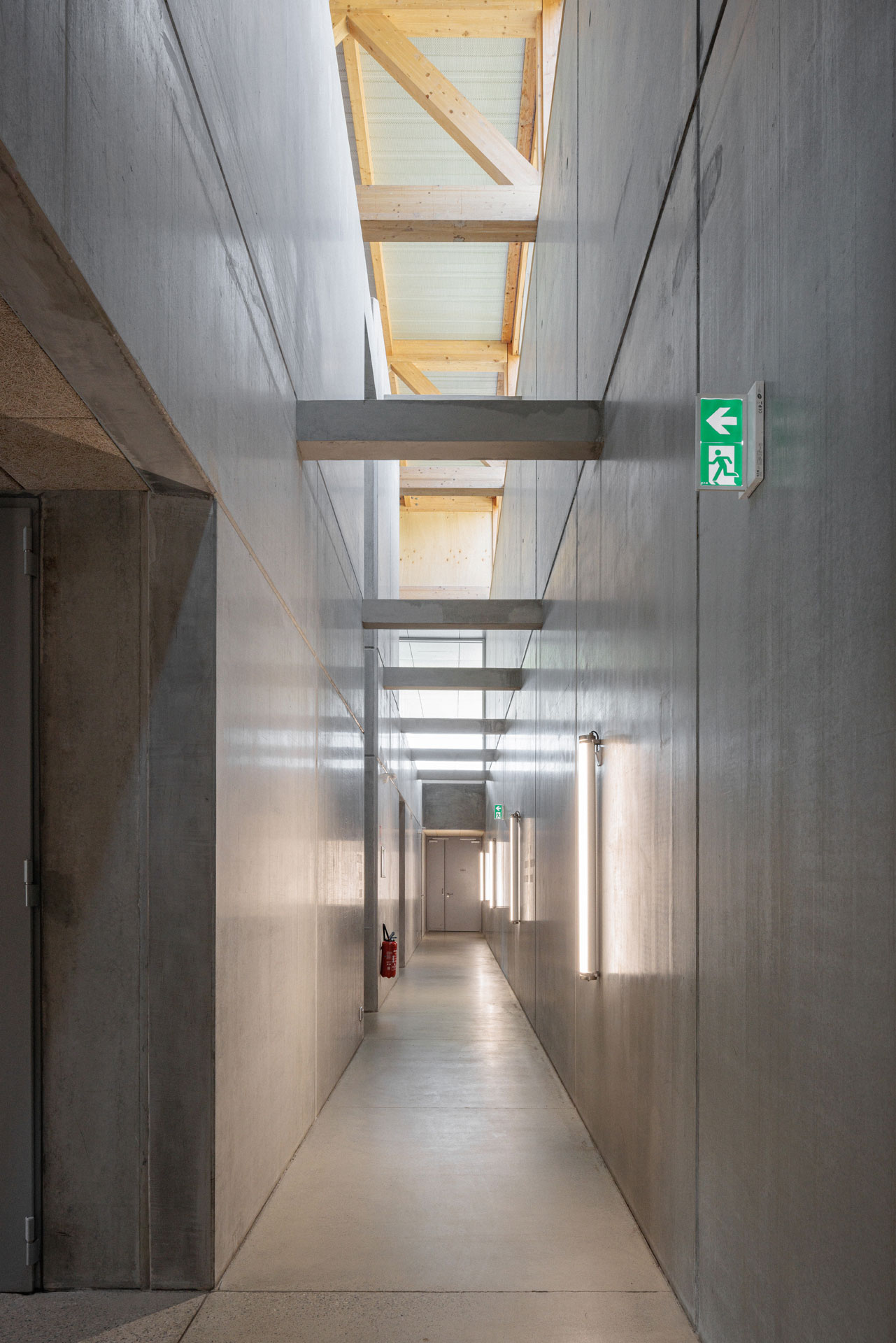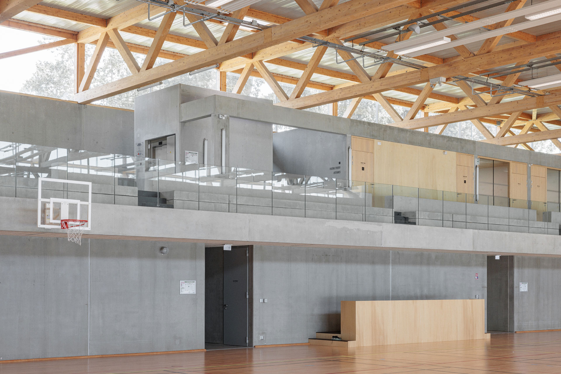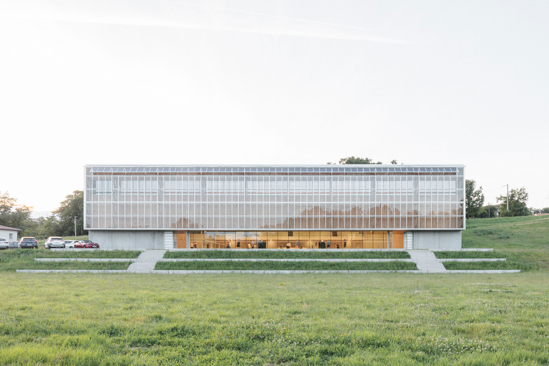 Le nouveau gymnase d’Escalquens, connecté au nouveau collège, propose une offre sportive qualitative aussi bien pour les élèves que la population locale. L'intégration semi-enterrée du bâtiment permet à la fois de respecter le site existant et de produire un ensemble cohérent avec son environnement. Le projet vient ainsi s’implanter sur la plateforme existante pour proposer un ensemble compact et fonctionnel. Cette déclivité naturelle du terrain nous a permis de proposer une entrée haute, donnant au complexe une façade urbaine ouverte sur la ville. L'entrée principale à mi-hauteur permet donc un accès direct et simple depuis le collège et donne à l’ensemble son identité d’équipement public. Ce projet illustre notre engagement "low-tech", par le réemploi des énergies existante. C'est la première de nos réalisations à proposer une façade pariétodynamique : l’énergie solaire captée par la grande façade vitrée au Sud permet, grâce au principe d’effet de serre de chauffer de l’air qui sera ensuite envoyé dans le bâtiment. Cette façade est ensuite ventilée pour éviter la surchauffe. Cette proposition confère alors au bâtiment son image architecturale, sans nécessité de gestion ou d’entretien particulier.