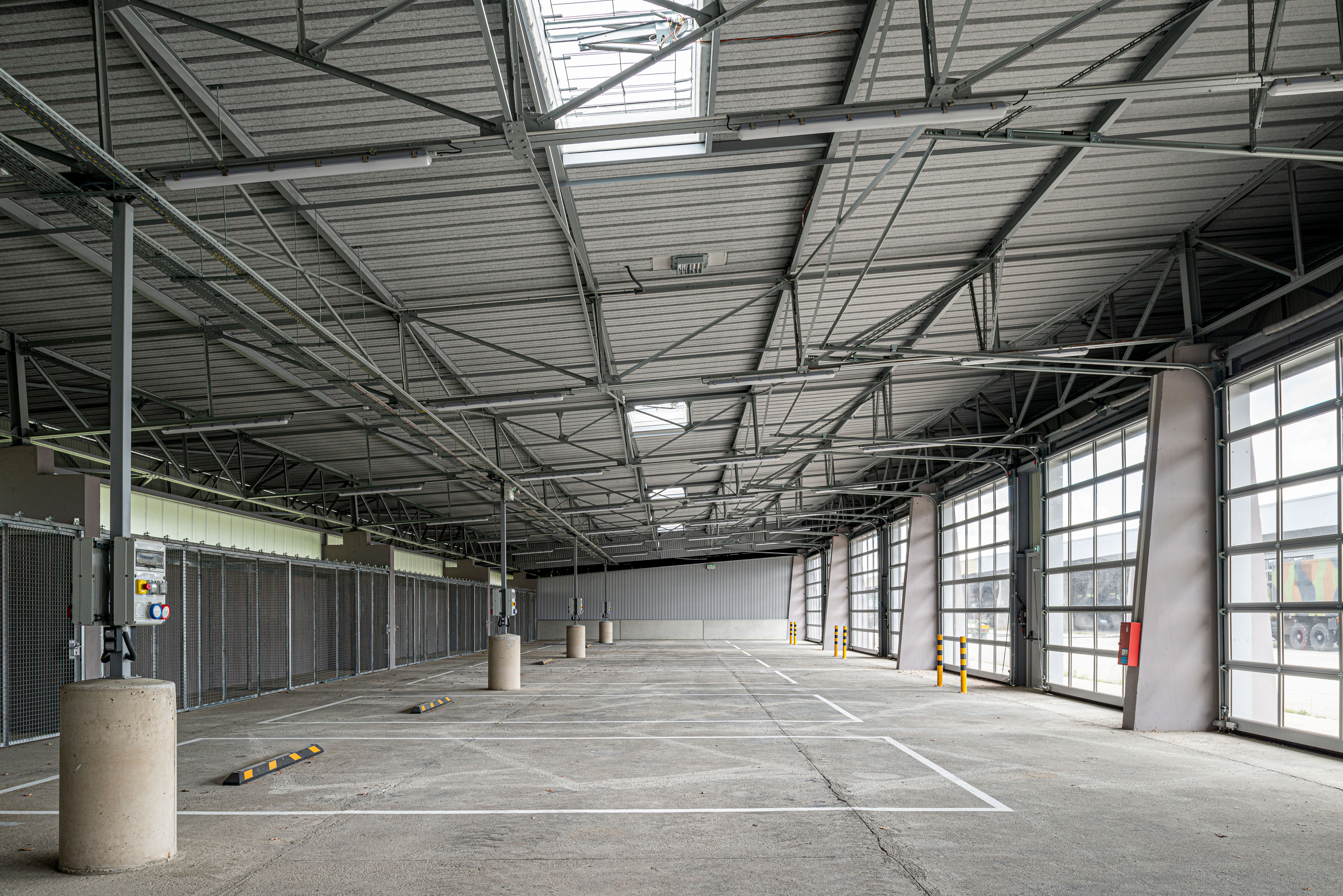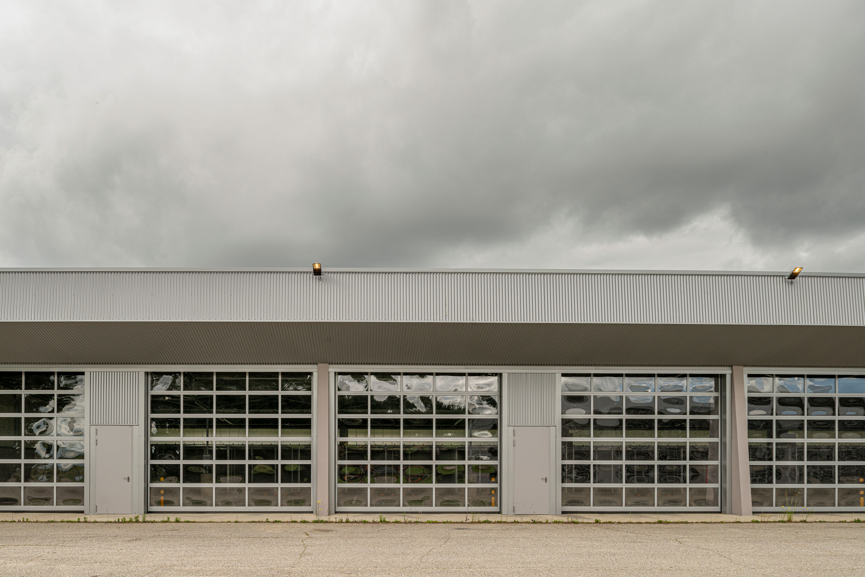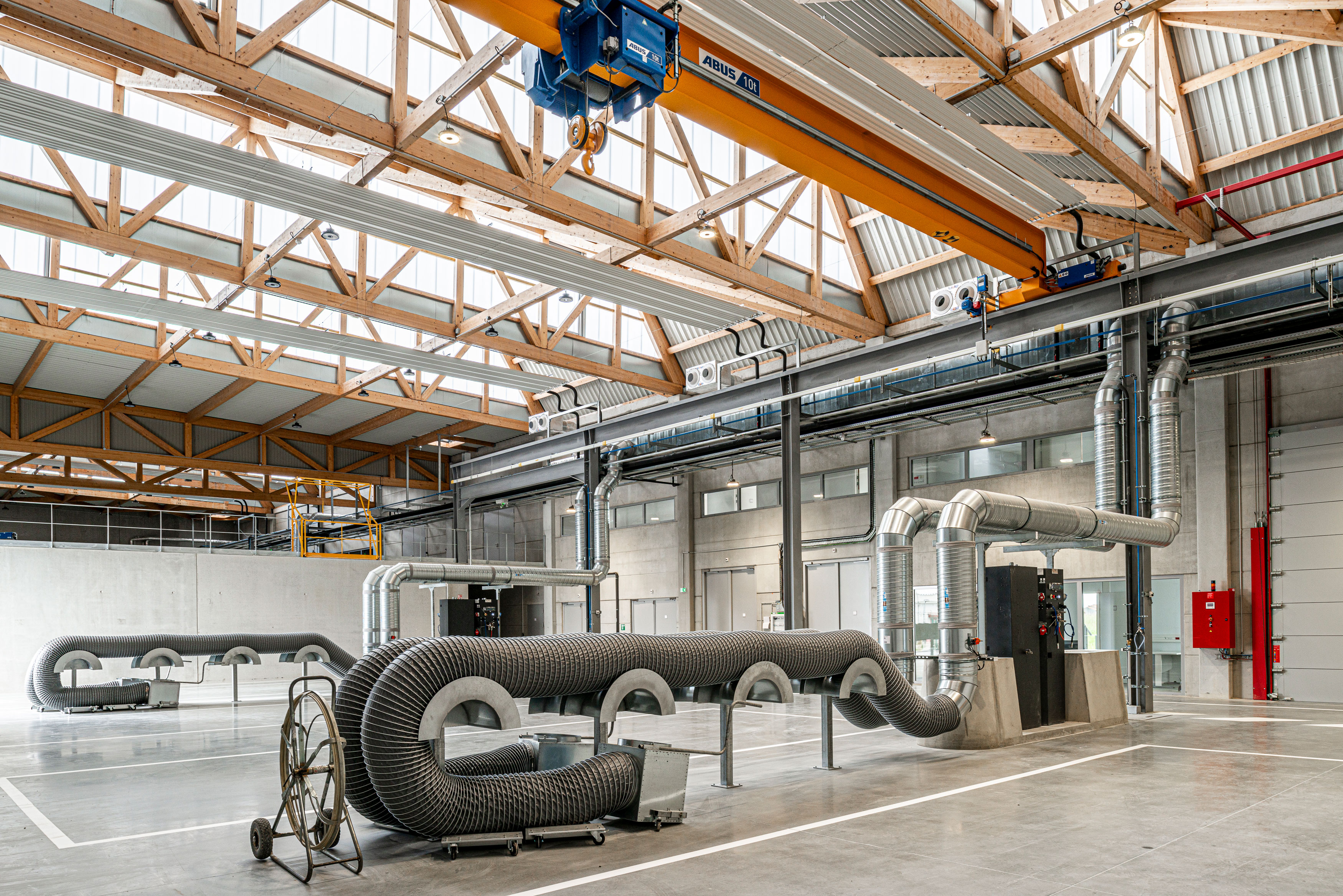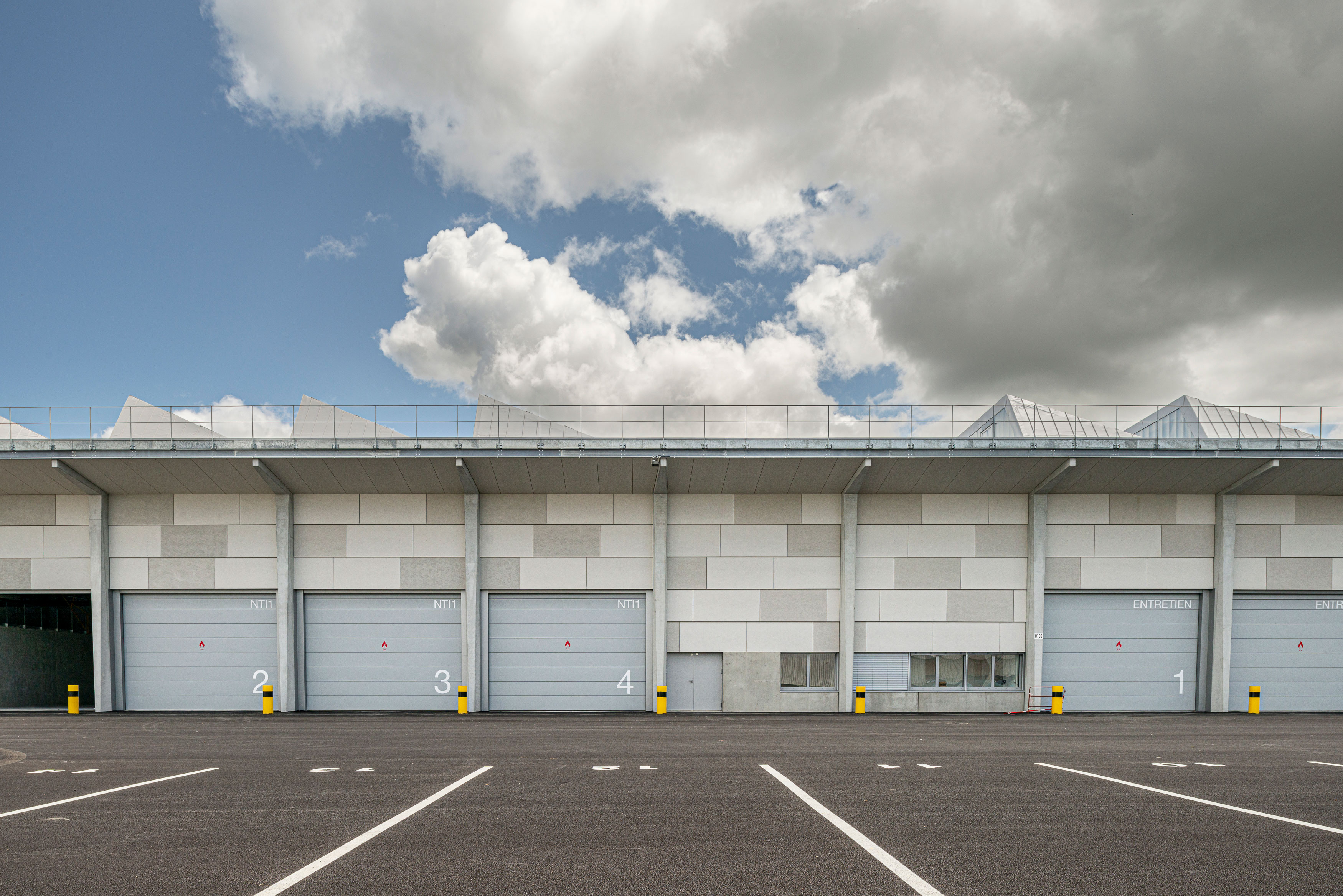 Le projet propose une solution synthétique permettant de répondre à l’ensemble des contraintes du programme et du site : les trois nouvelles entités – station d’entretien, NTI1, atelier multi-technique – sont regroupées dans une vaste halle modulable qui s’adapte à leurs spécificités. D’inspiration industrielle dans son mode constructif, le bâtiment base son expression architecturale sur ses larges dimensions, son horizontalité, le rythme régulier de sa structure et ses matériaux bruts, en écho aux bâtiments existants. La toiture joue un rôle majeur dans l’expression du bâtiment par ses débords et ses sheds. Leurs plis nets évoquent la géométrie des bateaux et des avions furtifs, ils sont orientés vers le Nord et disposés à l’aplomb des trois halls techniques auxquels ils apportent un éclairage zénithal homogène.