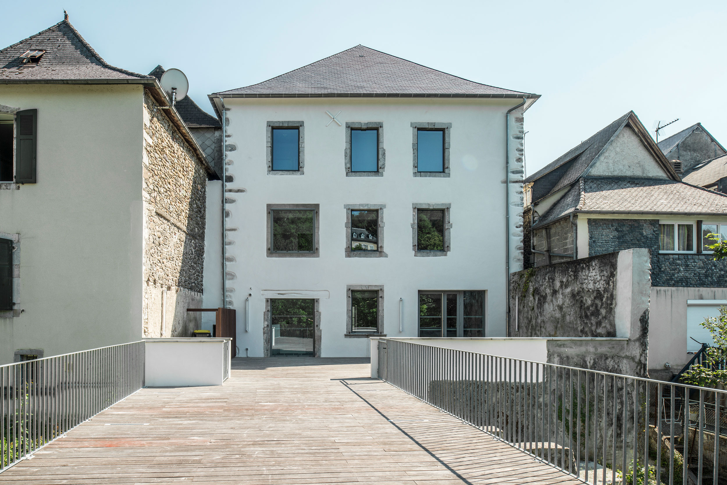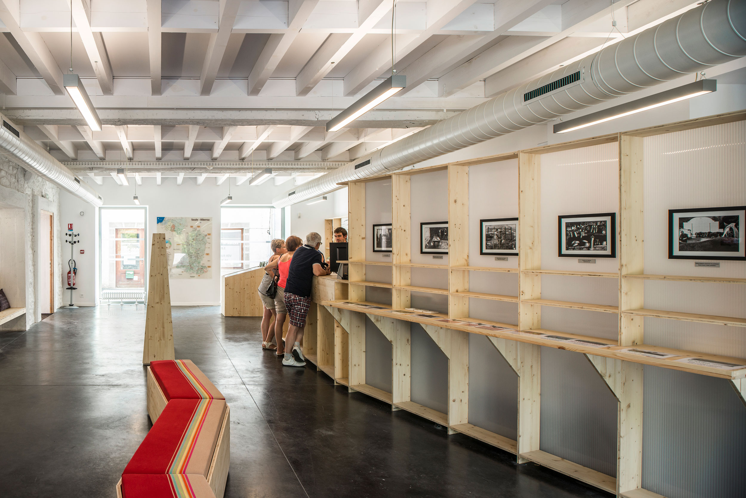 La Communauté de communes de Soule Xiberoa et le Syndicat d’initiative de Haute Soule ont décidé de valoriser leurs grands sites touristiques en transformant l’ancienne maison du docteur Elisseche à Tardets (64) en Maison du Tourisme de la Vallée de Soule. Cette maison de ville bénéficie d’une situation privilégiée puisqu’elle se situe sur la place du village. Le programme identifie trois espaces : • l’espace d’information au RDC, largement vitré et traversant, s’ouvrant sur une terrasse extérieure reliée à un belvédère permettant de profiter de la vue sur la rivière et le vergeren contrebas • des locaux administratifs au R+1 avec bureaux et espaces de travail mutualisés • un espace d’exposition situé au dernier niveau, sous la charpente restaurée. Les deux entités publiques sont visuellement rattachées par le sas d’entrée, en triple hauteur, véritable hall de la maison. Ce lien est accentué par la présence d’un escalier matérialisant la relation entre la partie basse et la partie haute. Le projet cherche ainsi, à travers une organisation rationnelle, la perméabilité horizontale et verticale du bâtiment. Les visiteurs sont invités au parcours sans mise en place de signalétique lourde.