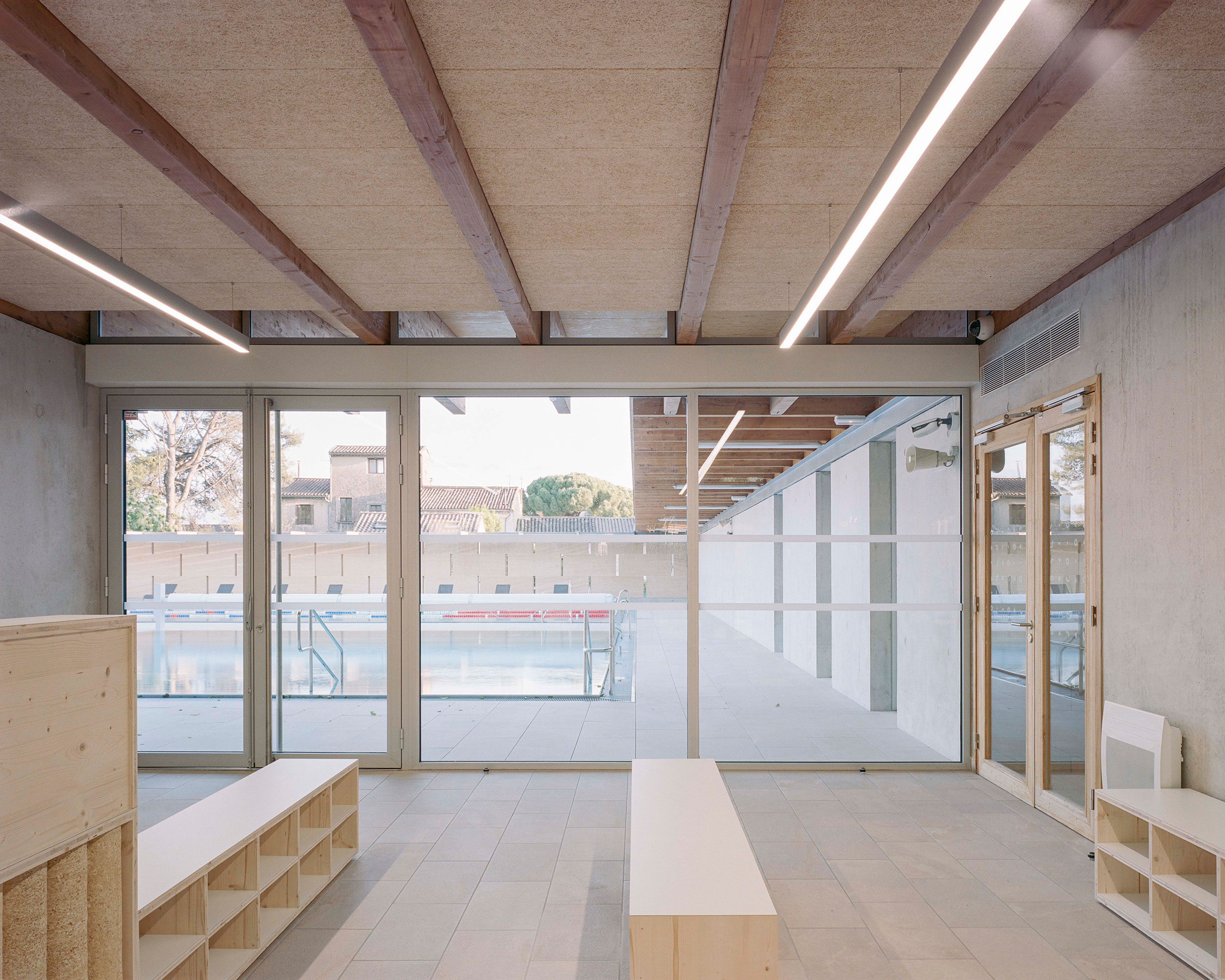 La piscine de Quissac s’inscrit dans le centre-bourg. Conçue telle un écrin en pierre de taille, elle protège les bassins de son environnement urbain. La pierre accompagne le baigneur dans son parcours, depuis l’entrée jusqu’aux plages. Une charpente bois constituée de poutres répétitives repose sur ces murs. Elle laisse entrer la lumière d’un côté et abrite les baigneurs côté plage. L’architecture sobre entre modernité et patrimoine utilise des matériaux locaux comme la pierre de Vers issue des carrières locales et le bois. La nouvelle piscine deviendra un nouveau repère architectural au cœur de Quissac. Le projet privilégie les énergies renouvelables, ce qui permet de maitriser la consommation d’énergie et réduire les coûts d’exploitation et de maintenance.