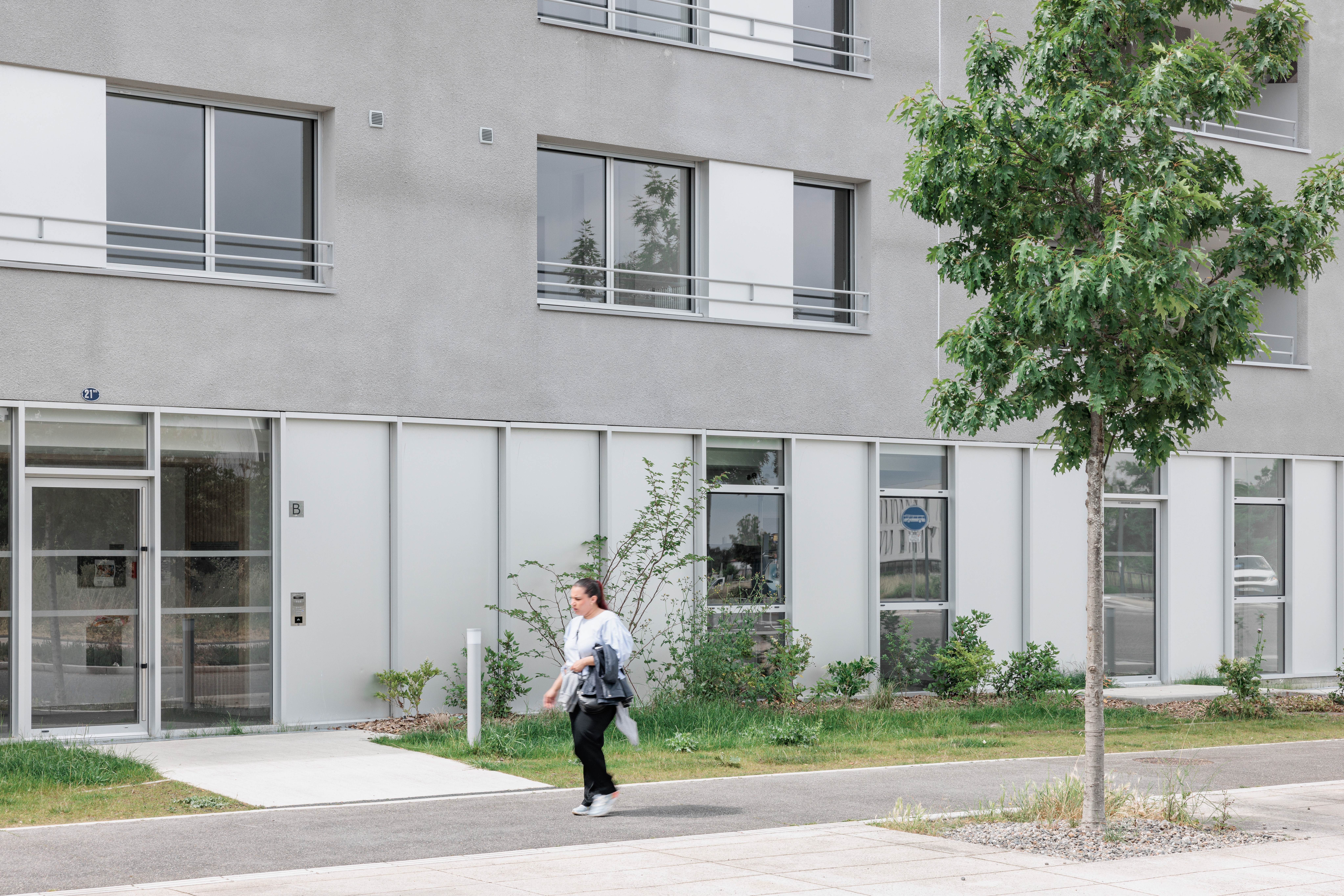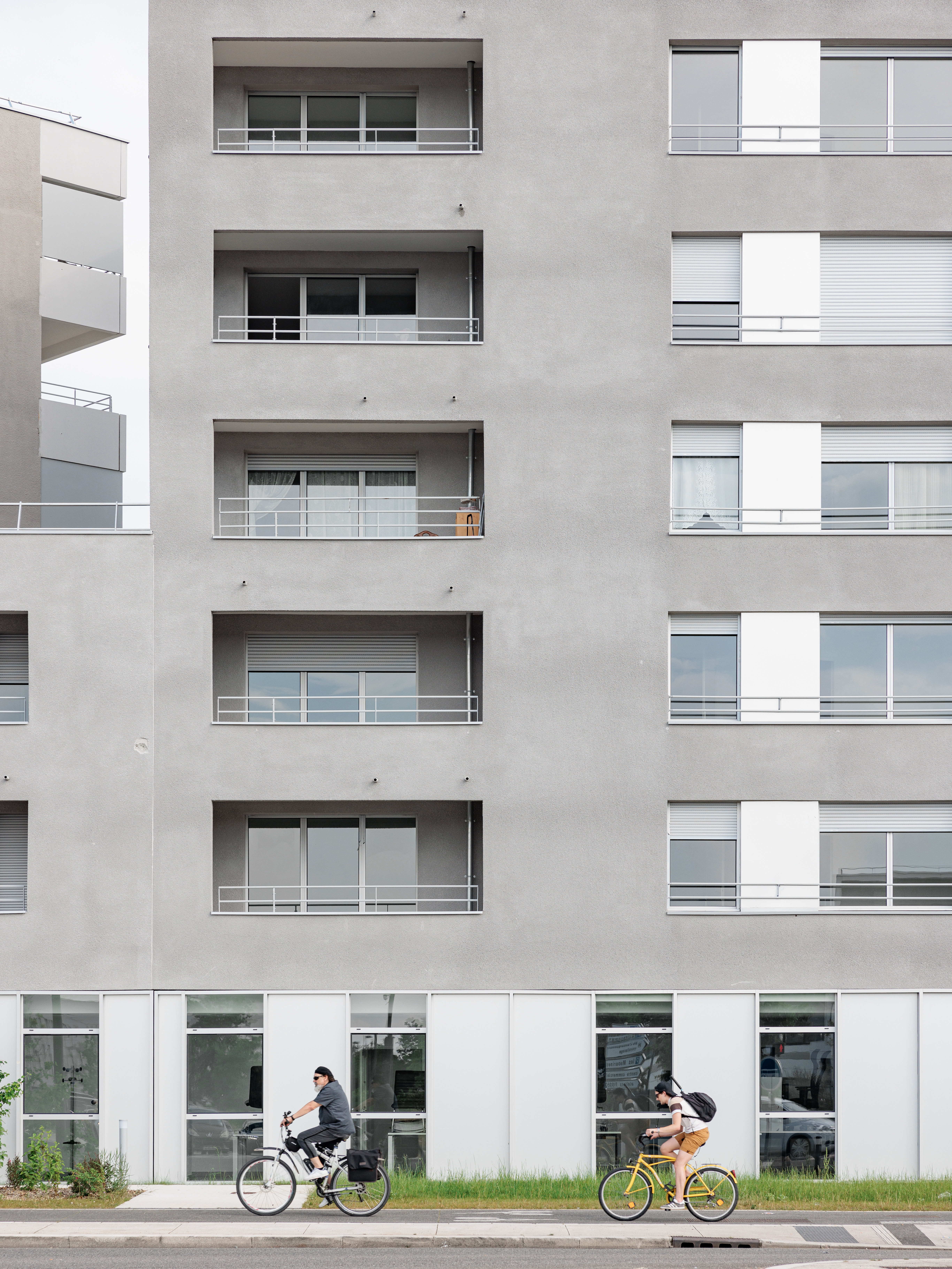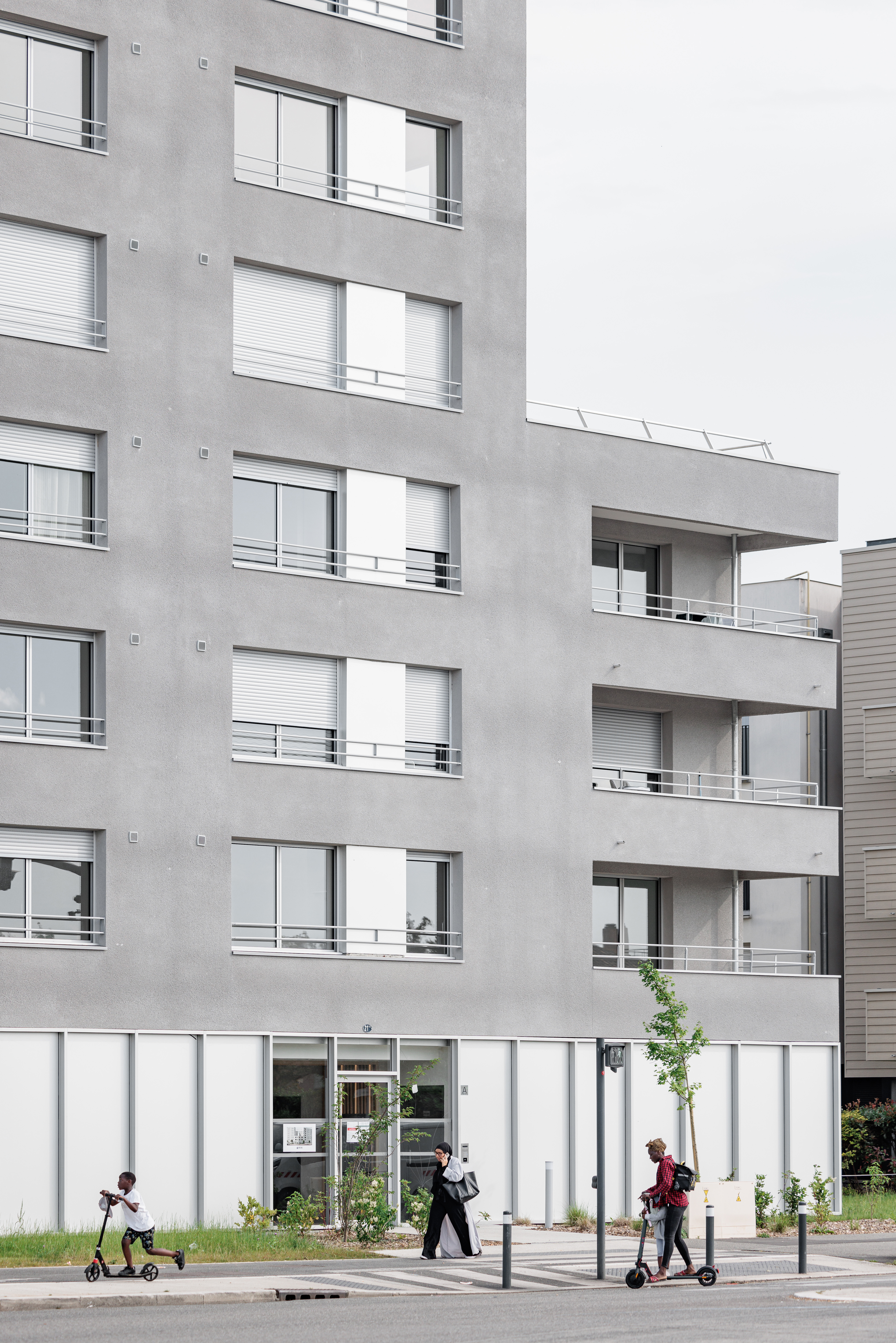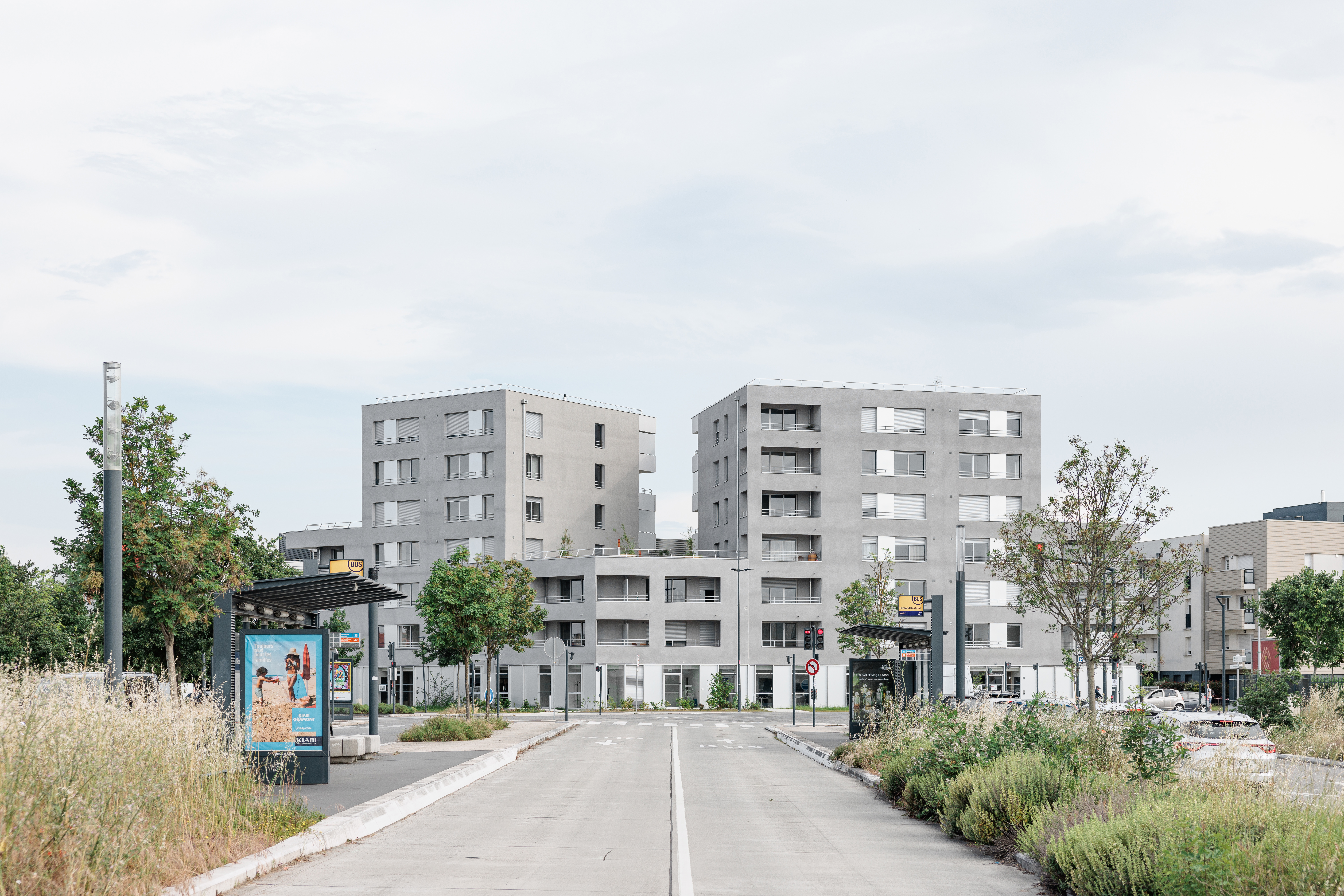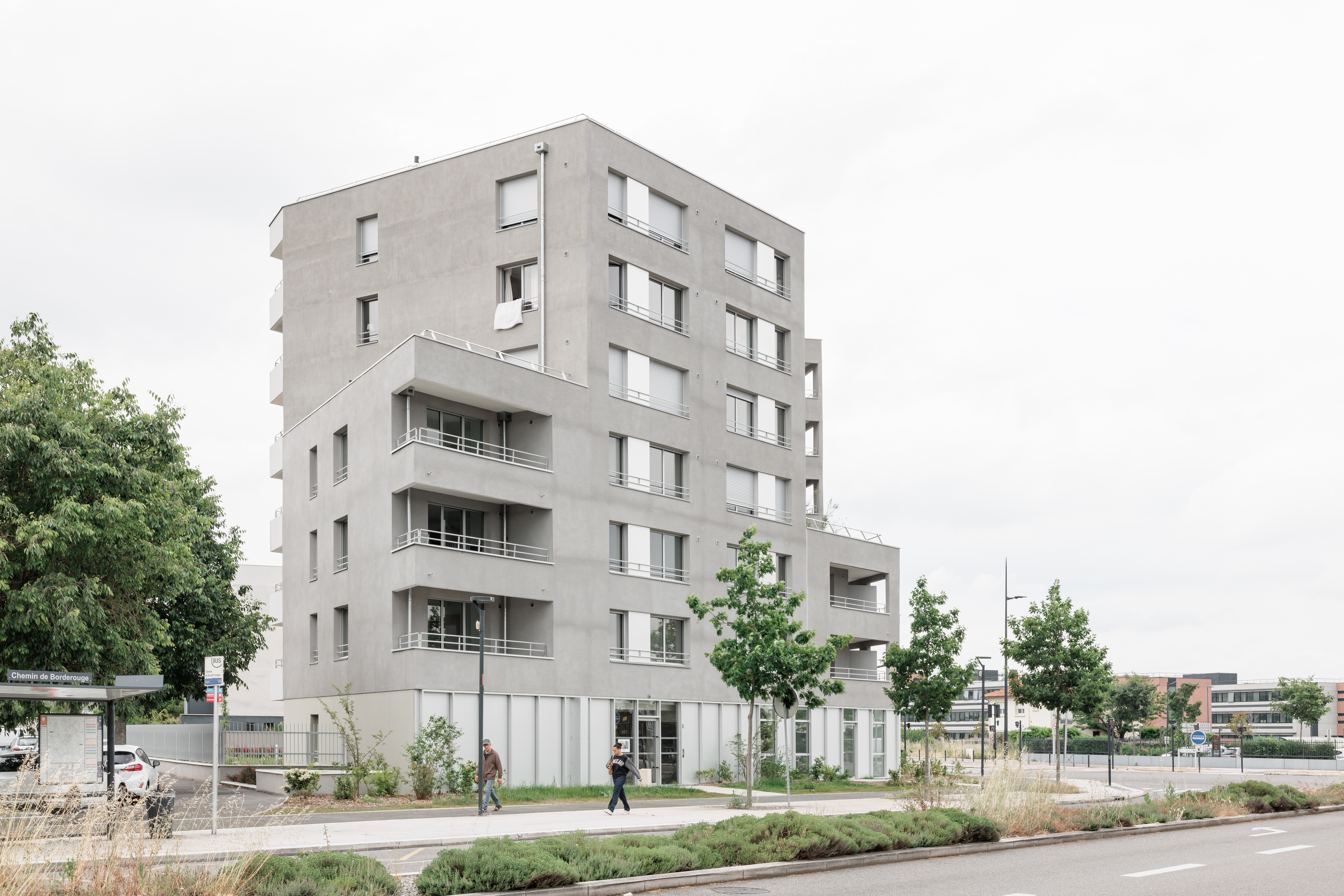 Le projet se situe sur l’emplacement stratégique du carrefour de la ZAC Borderouge et du Boulevard Urbain Nord. Cet axe charnière doit être assumé par des principes urbains forts, qui développent un bâtiment mixte de commerces et de logements comme un signal. Il fait aussi couture avec les logements récents en R+2 et R+3 qui bordent la parcelle. Le projet redéfinit ainsi deux échelles : l’échelle urbaine et l’échelle de l’habitant. Sa volumétrie traduit une densité graduelle qui s’inscrit dans la continuité de son contexte urbain. Bien que variée et crénelée, elle s’appuie sur une trame constructive rigoureuse. La perception du projet depuis l’espace public est donc animée et diffère d’une façade à une autre.