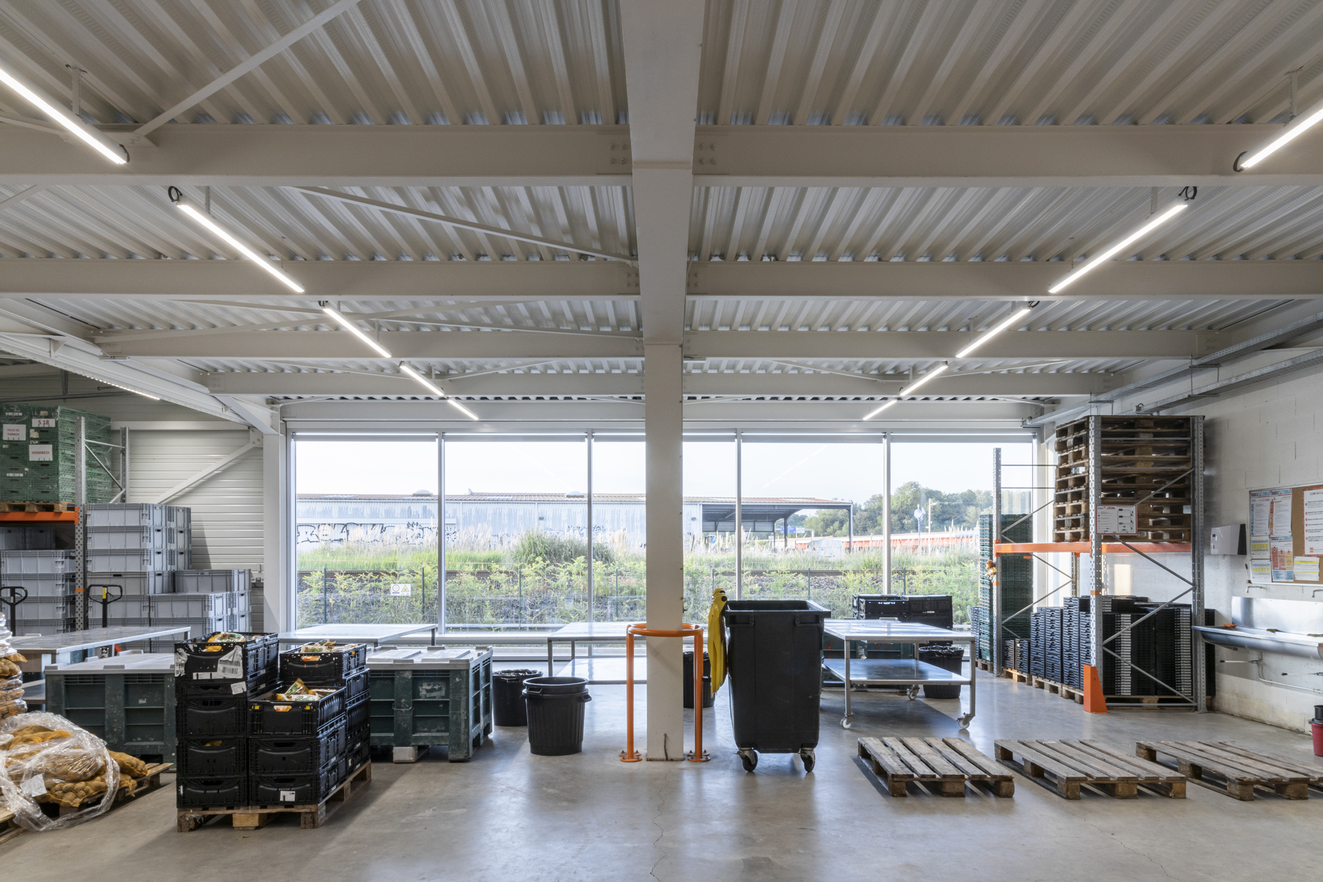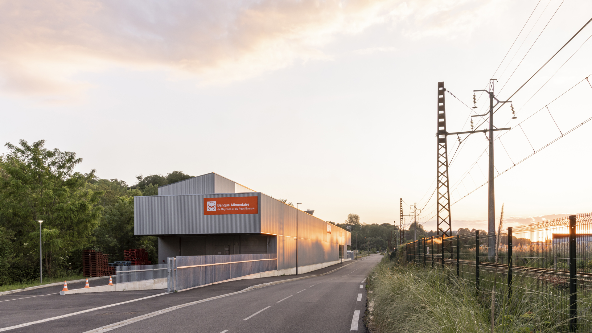 Le projet contient l’ensemble du programme en un seul volume simple, implanté sur la partie la plus large du site (à l’Ouest) et en limite de parcelle afin d’offrir des volumes de stockages intérieurs aux proportions optimales. Posé sur un socle en béton pour respecter la côte d’inondabilité, il est « creusé » aux deux extrémités pour couvrir les zones de livraisons et expéditions des véhicules. En son centre, la toiture se soulève pour apporter de la lumière zénithale à travers le shed dans les zones de convivialité, de stockage et de travail. Également, une large baie éclaire une zone de travail très utilisée par les bénévoles et quelques percements à l’étage sur les bureaux se fondent dans la masse derrière un bardage perforé. Ce projet s’appuie sur une volonté d’utiliser des matériaux pérennes et faciles d’entretien en accord avec les capacités de l’association et, dans la mesure du possible, locaux. Contrairement aux bâtiments de stockage traditionnels, par le système constructif mis en œuvre, sa forme compacte et la position d’ouvertures au Nord, le projet permet de garantir une isolation continue de l’ensemble du volume et de limiter les déperditions thermiques. Cette configuration favorise un confort de travail pour les bénévoles été comme hiver, une économie des coûts d’exploitation et de maintenance, le respect des règlementations environnementales pour la partie bureaux et un usage des halles à température ambiante.