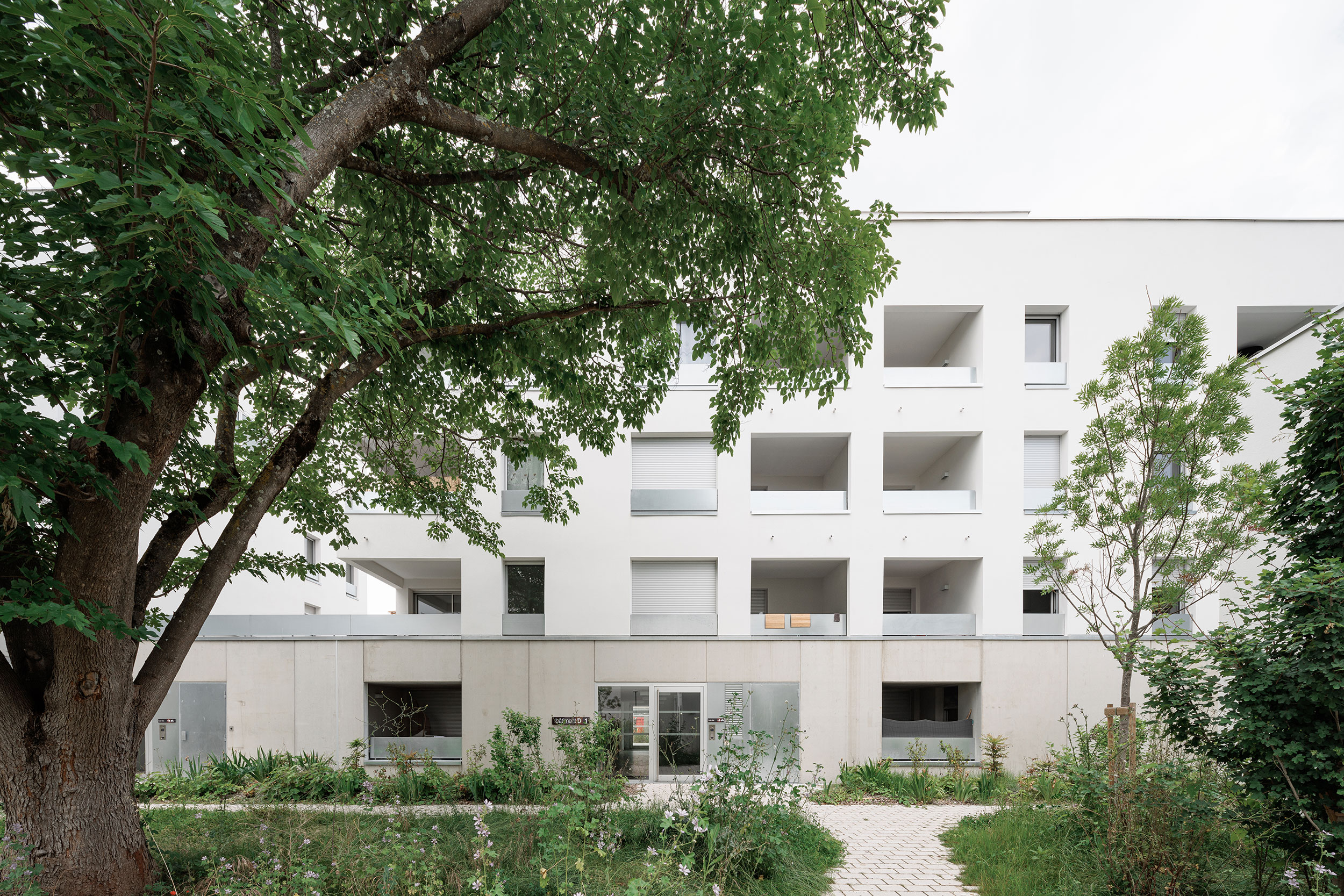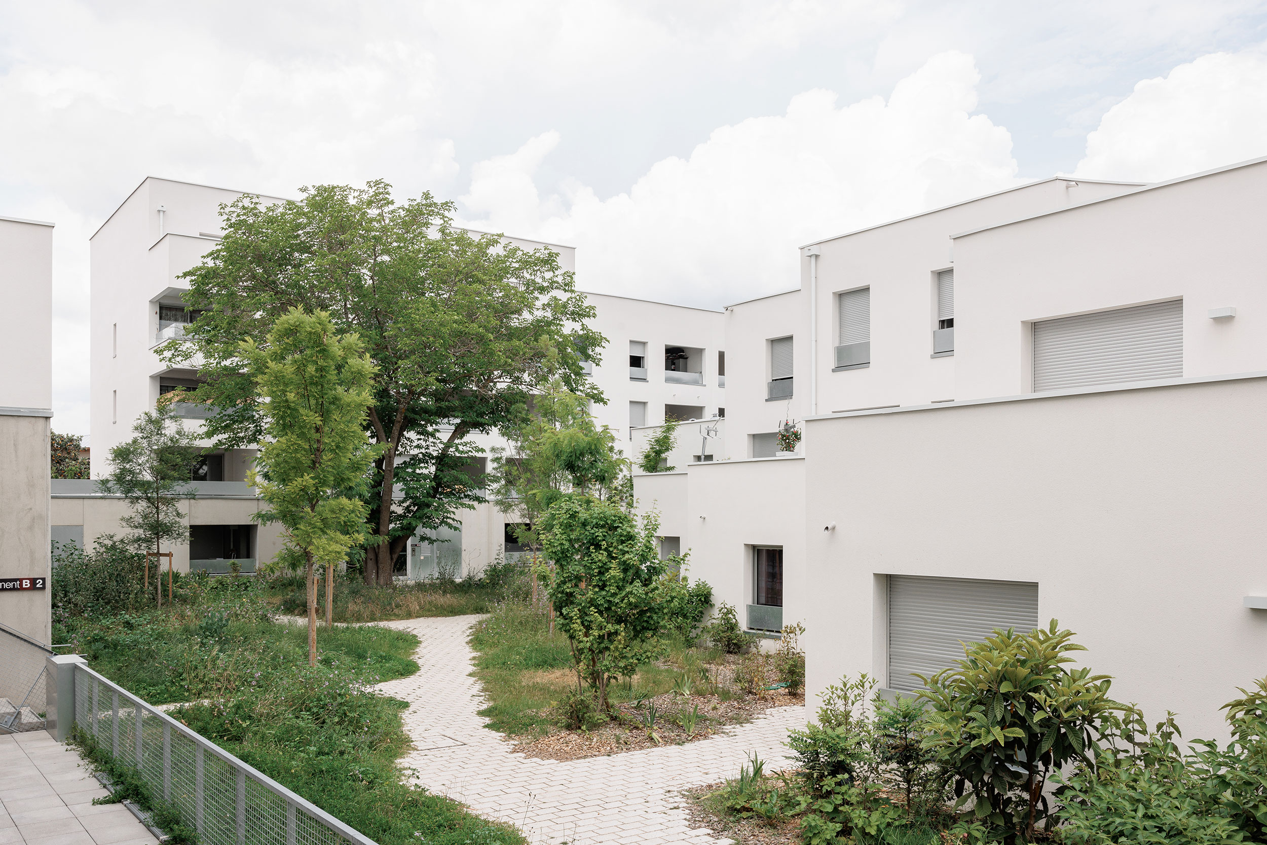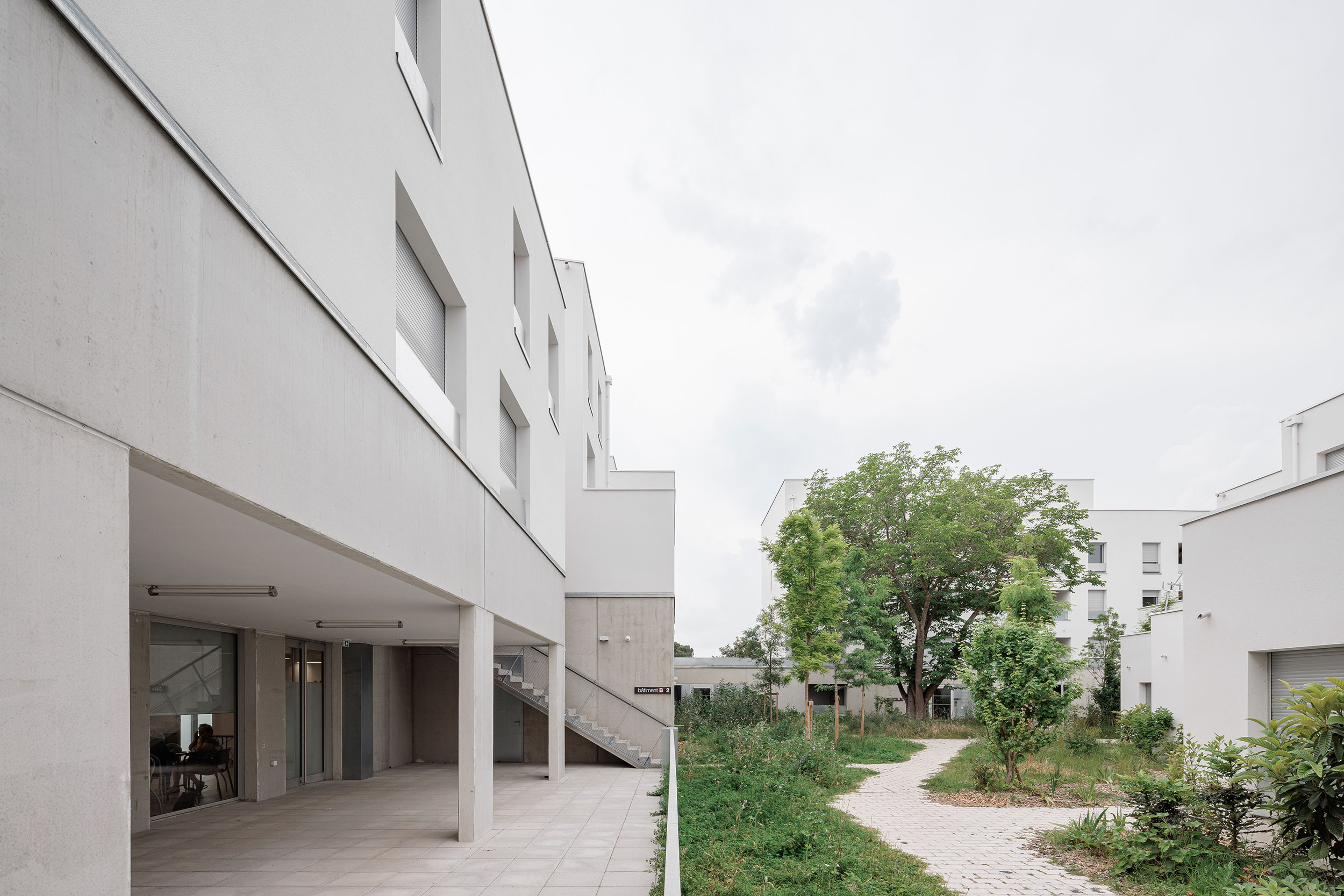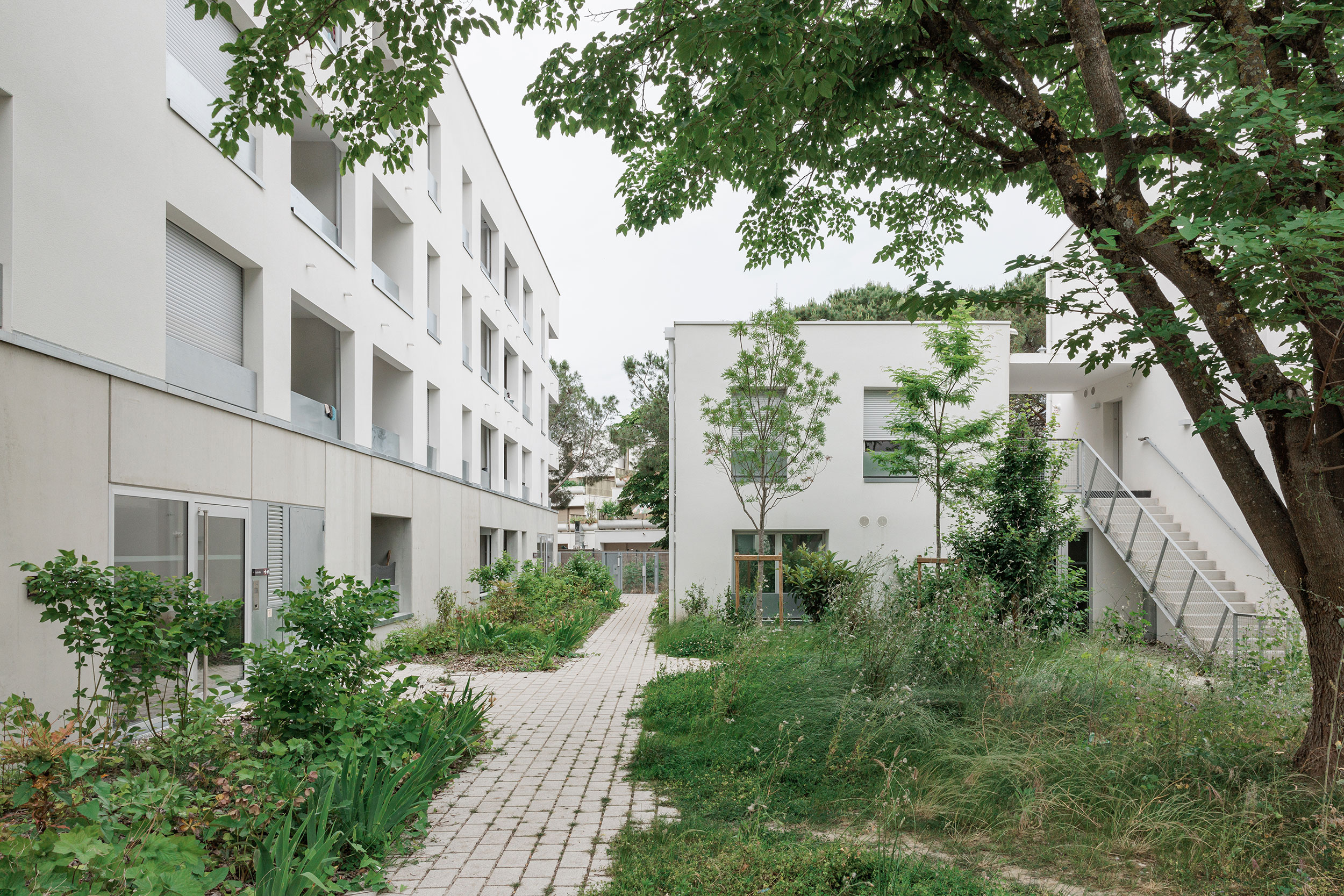 L’esprit du lieu existant, avec son alignement de pins parasols, a donné naissance à ce projet de Cité Jardin. Les volumes, de plus grande hauteur aux extrémités, délimitent les contours de l’îlot tandis que le cœur est traversé par la masse végétale. Les logements sont disposés autour, de manière à profiter des meilleures conditions d’ensoleillement, de calme, et d’espaces extérieurs rejoignant ainsi notre proposition : Habiter un paysage arboré. Le socle en béton préfabriqué abrite plusieurs équipements dont un espace sénior, une crèche, un local associatif et des bureaux.