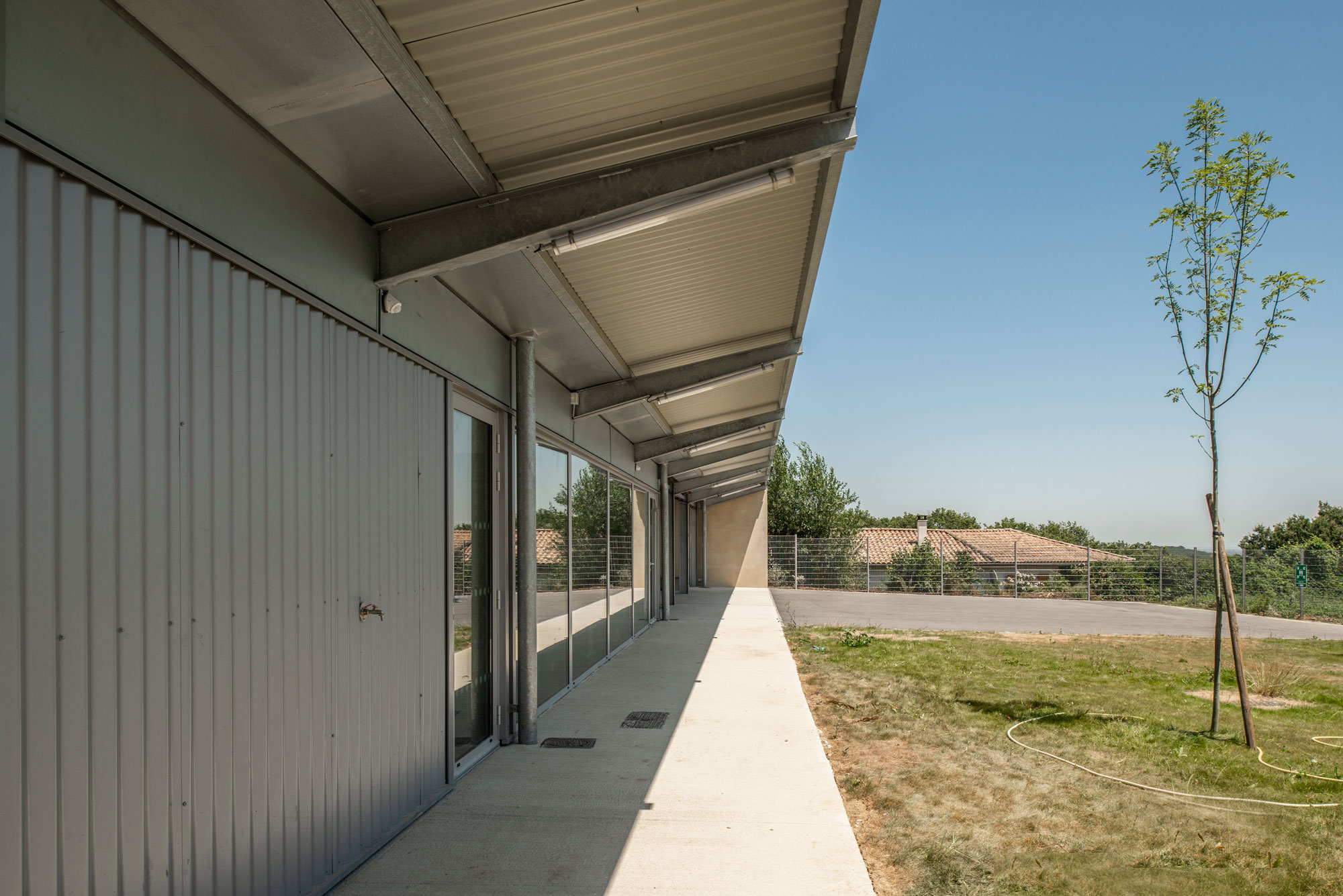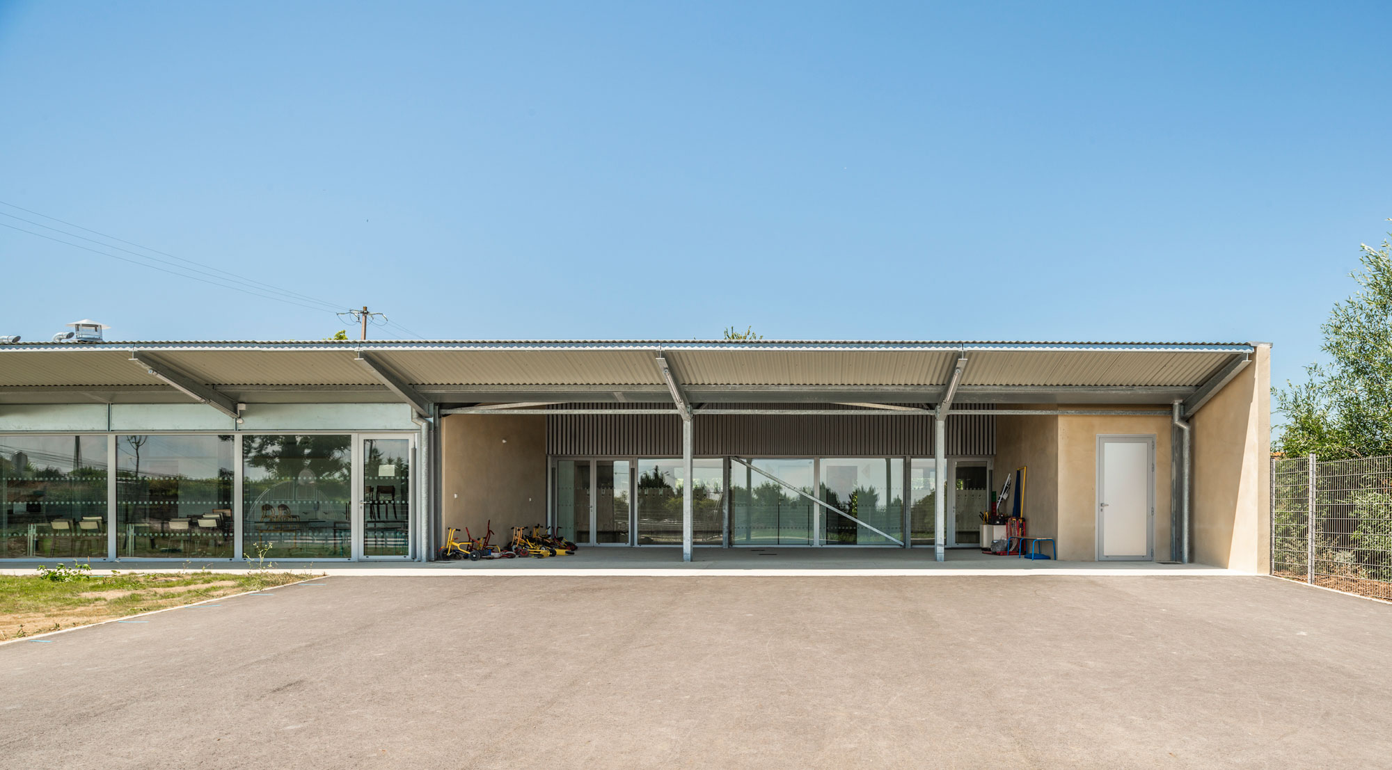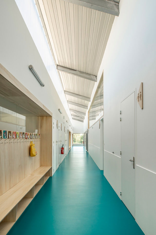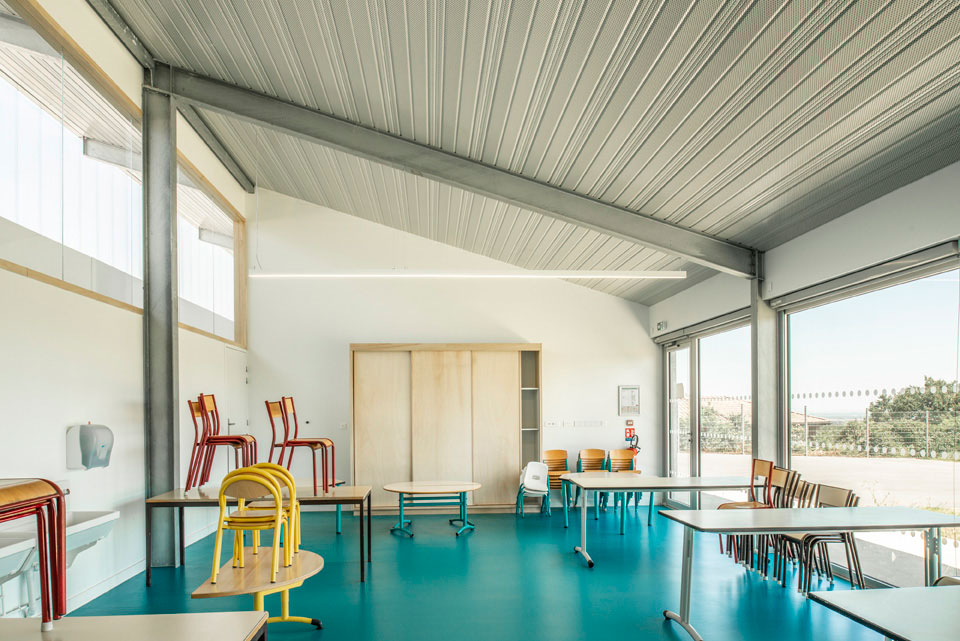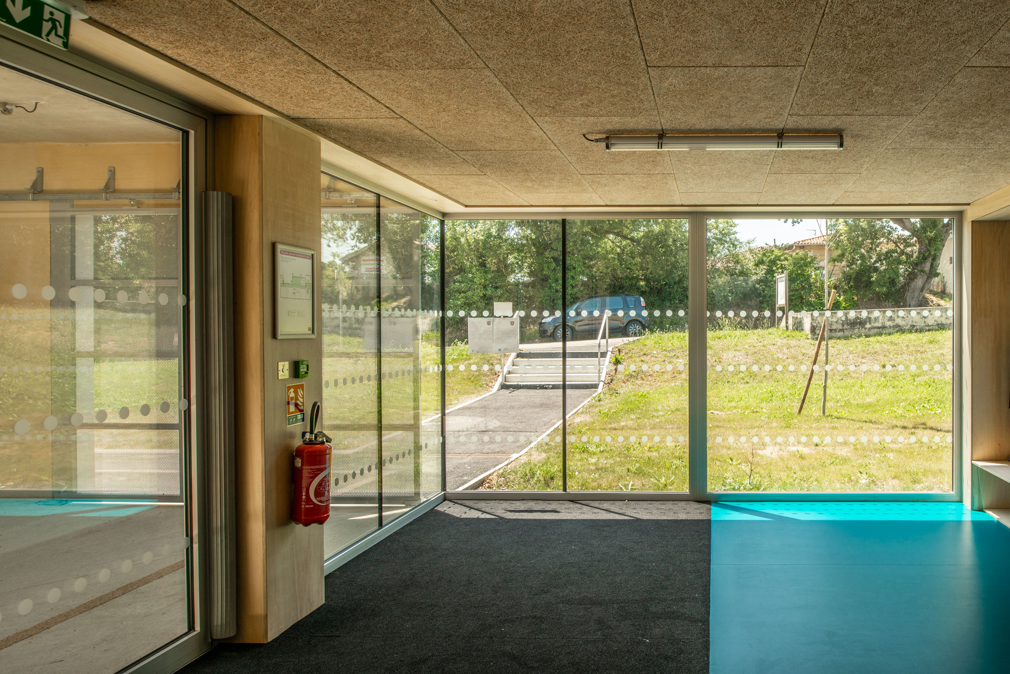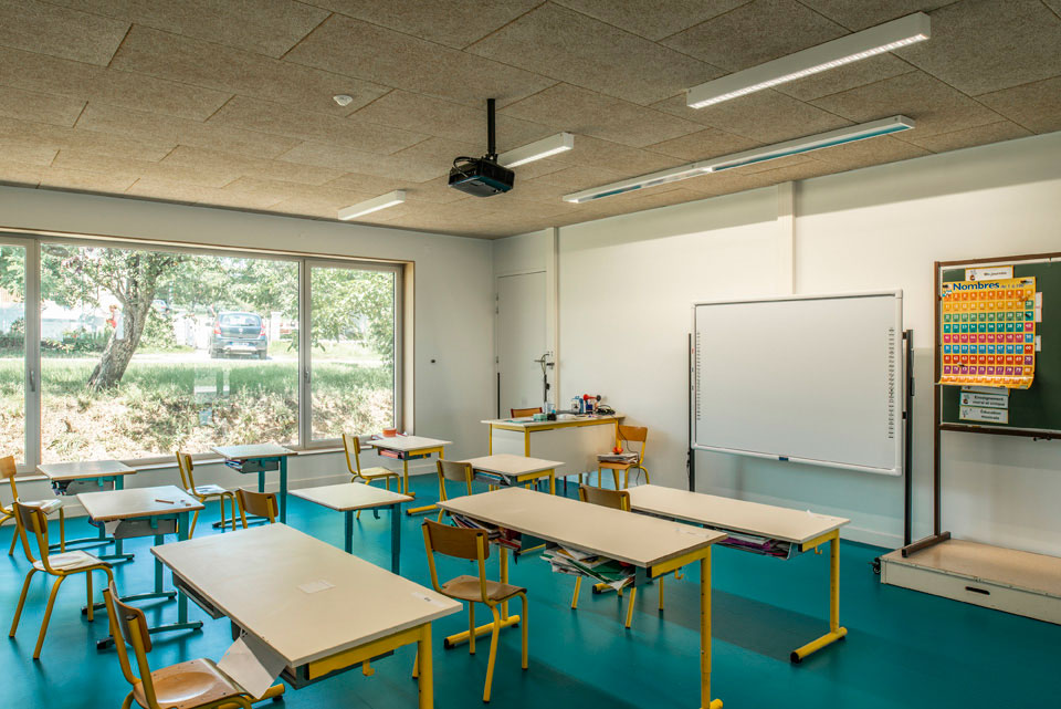 A l’échelle urbaine, le bâtiment est repérable et facile d’accès. Cette école élémentaire occupe une position urbaine stratégique, sa proximité avec le centre bourg est un privilège. Les enjeux du projet sont donc doubles : créer un lieu d’éducation neuf, fonctionnel et accueillant que ce soit pour les élèves, enseignants et autres utilisateurs mais également un équipement public durable à coûts maîtrisés et facile à entretenir. Le long d'une rue intérieure éclairée par un shed, l'école s'ouvre sur le paysage par de généreuses baies vitrées cadrant le paysage.