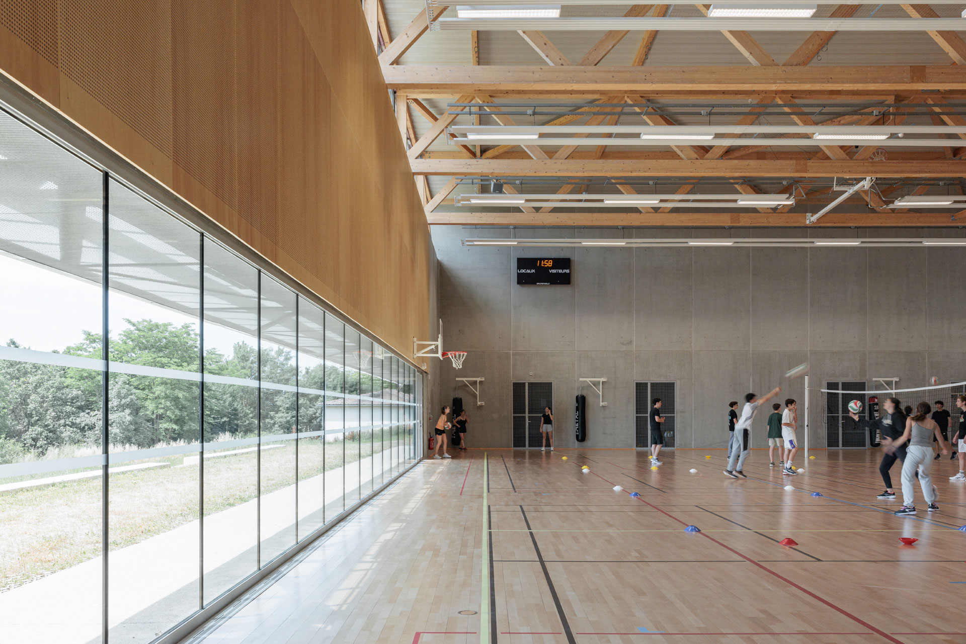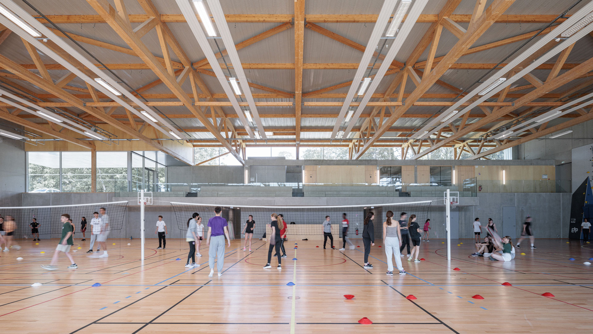 Le nouveau gymnase d’Escalquens, connecté au nouveau collège, propose une offre sportive qualitative aussi bien pour les élèves que la population locale. L'intégration semi-enterrée du bâtiment permet à la fois de respecter le site existant et de produire un ensemble cohérent avec son environnement. Le projet vient ainsi s’implanter sur la plateforme existante pour proposer un ensemble compact et fonctionnel. Cette déclivité naturelle du terrain nous a permis de proposer une entrée haute, donnant au complexe une façade urbaine ouverte sur la ville. L'entrée principale à mi-hauteur permet donc un accès direct et simple depuis le collège et donne à l’ensemble son identité d’équipement public. Ce projet illustre notre engagement "low-tech", par le réemploi des énergies existante. C'est la première de nos réalisations à proposer une façade pariétodynamique : l’énergie solaire captée par la grande façade vitrée au Sud permet, grâce au principe d’effet de serre de chauffer de l’air qui sera ensuite envoyé dans le bâtiment. Cette façade est ensuite ventilée pour éviter la surchauffe. Cette proposition confère alors au bâtiment son image architecturale, sans nécessité de gestion ou d’entretien particulier.