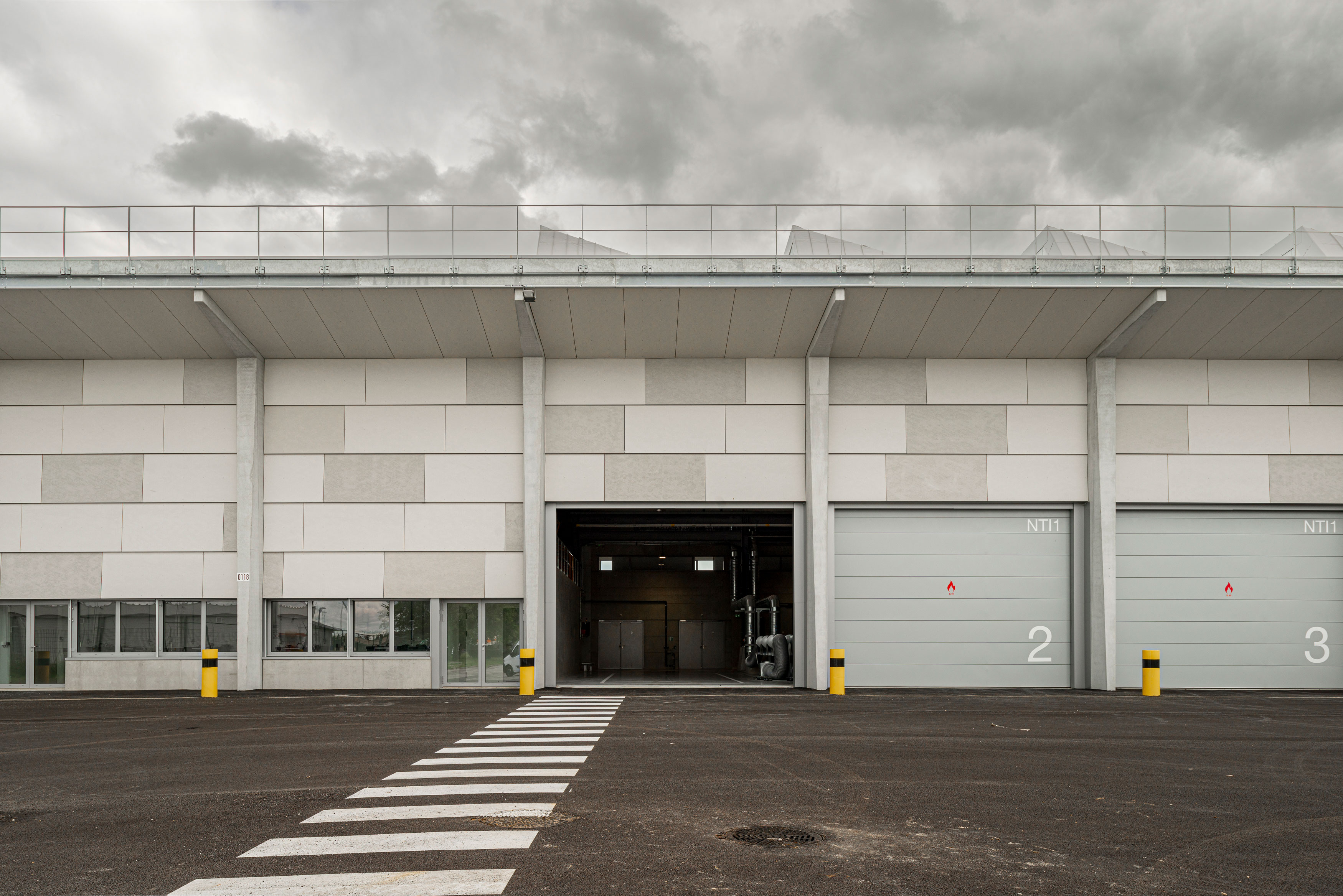 Le projet propose une solution synthétique permettant de répondre à l’ensemble des contraintes du programme et du site : les trois nouvelles entités – station d’entretien, NTI1, atelier multi-technique – sont regroupées dans une vaste halle modulable qui s’adapte à leurs spécificités. D’inspiration industrielle dans son mode constructif, le bâtiment base son expression architecturale sur ses larges dimensions, son horizontalité, le rythme régulier de sa structure et ses matériaux bruts, en écho aux bâtiments existants. La toiture joue un rôle majeur dans l’expression du bâtiment par ses débords et ses sheds. Leurs plis nets évoquent la géométrie des bateaux et des avions furtifs, ils sont orientés vers le Nord et disposés à l’aplomb des trois halls techniques auxquels ils apportent un éclairage zénithal homogène.