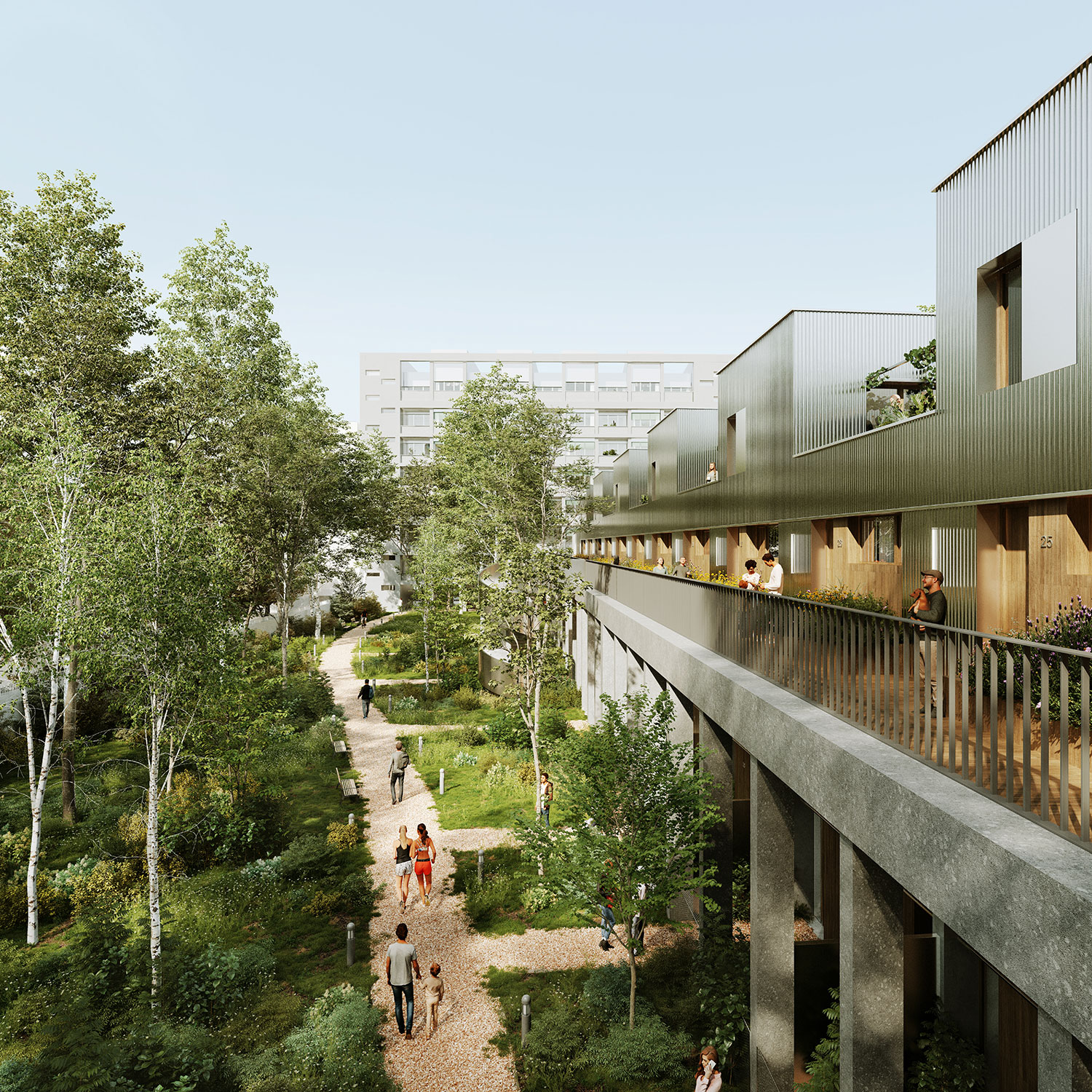 Ce projet vise à réinventer la construction urbaine en privilégiant la transformation des structures existantes, créant ainsi des logements atypiques tout en intégrant la nature et la fraîcheur au cœur de la ville pour améliorer la qualité de vie. La façade rénovée, marquée par les loggias, met en valeur l’ossature originale. Le bureau de Poste au rez-de-chaussée sera maintenu, tandis que les étages supérieurs, initialement des bureaux, seront transformés en logements. Une surélévation offrira des duplex avec vue. Ce projet place la nature au centre, avec des ambiances paysagères variées et un parcours arboré évoquant un parc. Les sols seront vivants et propices à la biodiversité et les mobilités douces seront privilégiées, en harmonie avec l'environnement.