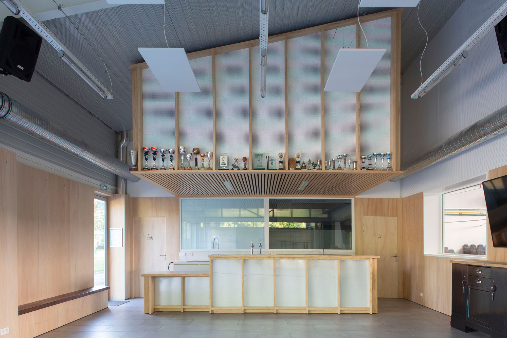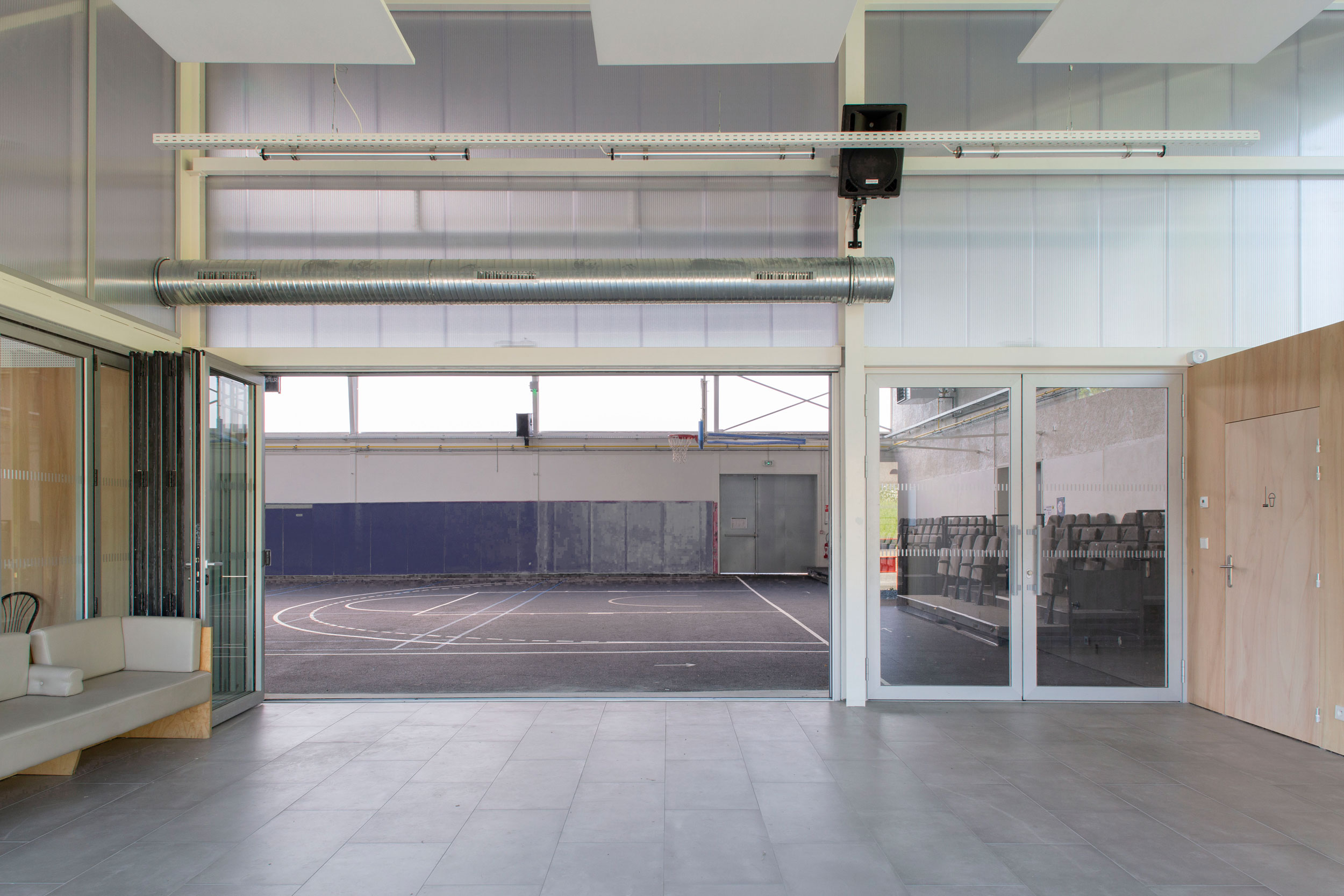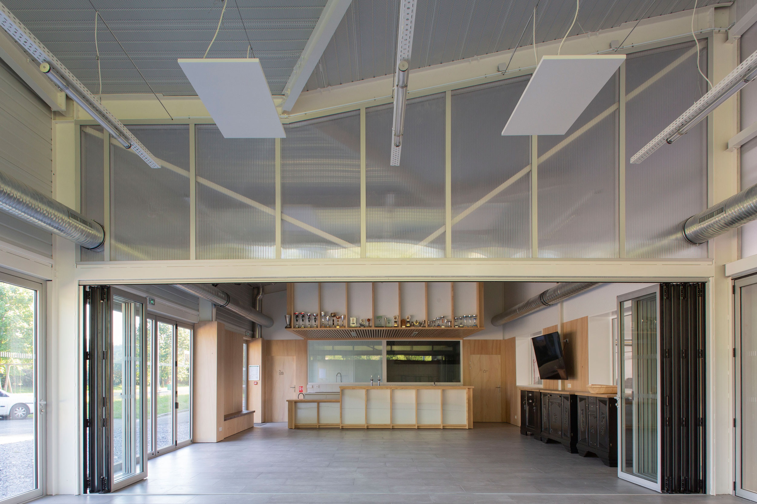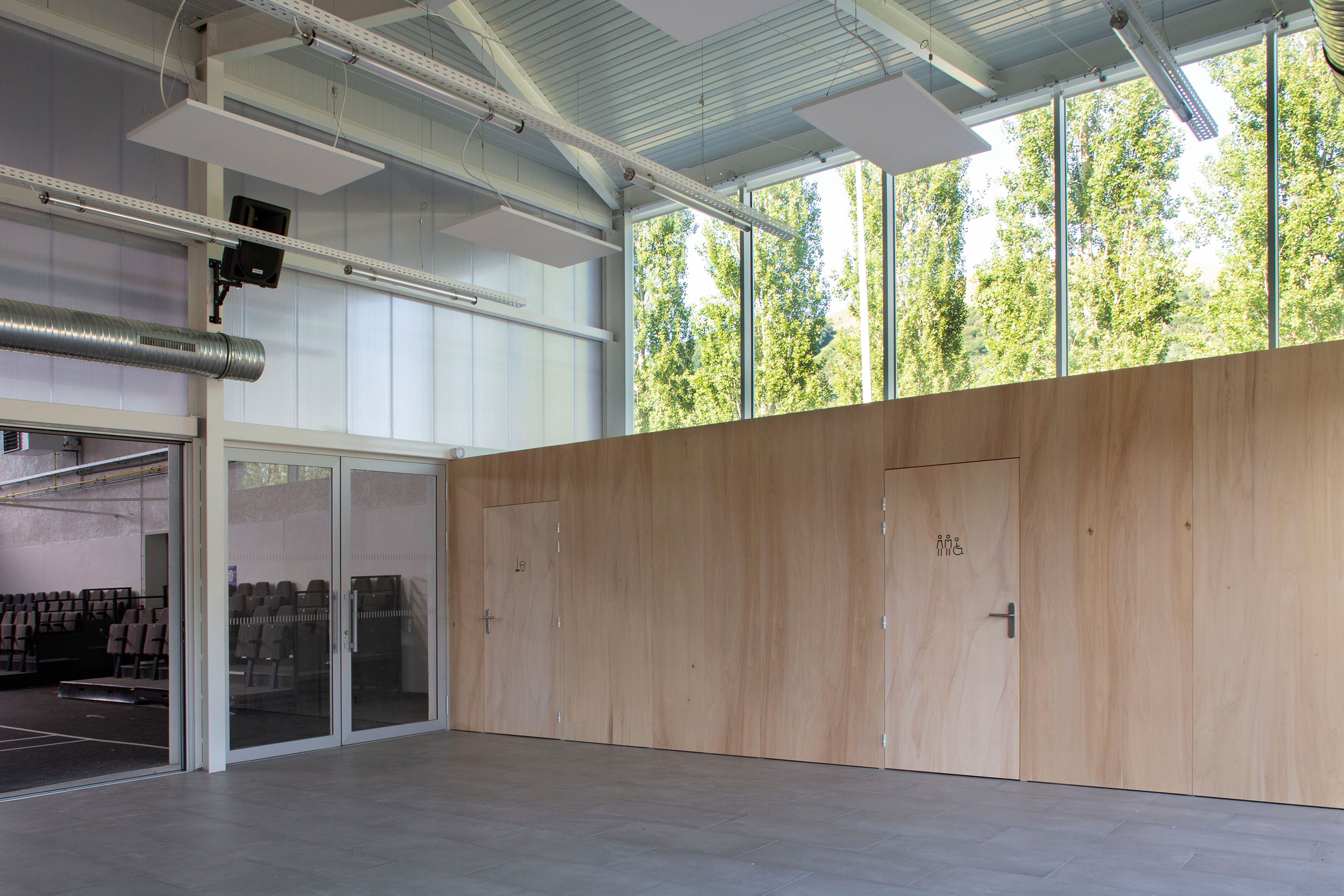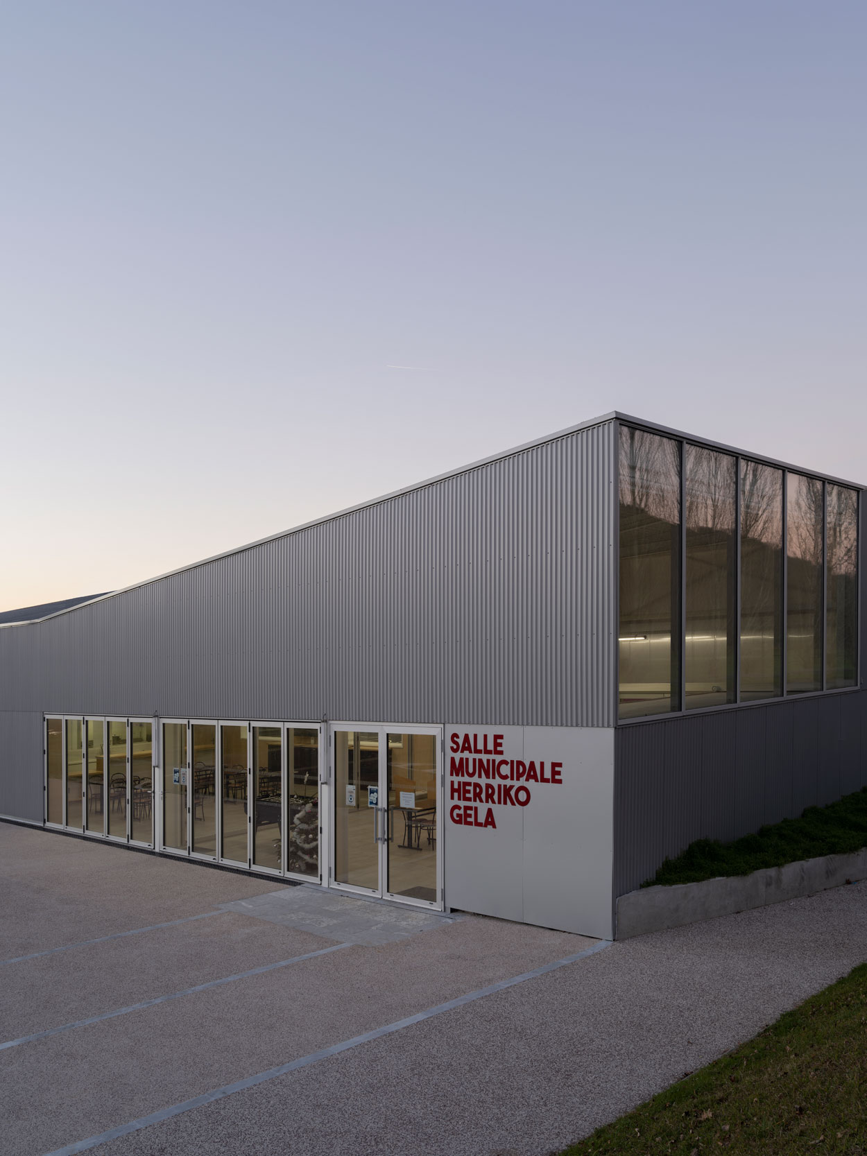 La rénovation de ce bâtiment touche à de multiples enjeux : • Profiter de la rénovation thermique du bâtiment pour lui redonner une image à la hauteur de ses nombreux usages • Créer un signal depuis la RD • Régler les conflits de flux entre l’usage sportif, scolaire et atelier municipal • Réorganiser la partie «publique» du bâtiment en créant un foyer, des cuisines et une entré valorisante. Comment proposer une nouvelle image à ce bâtiment, important pour Gotein comme pour Libarrenx ? Comment valoriser cette salle qui touche toutes les générations, à toutes les périodes de l’année ? Notre ambition nous a poussé à réfléchir à un modèle de salle polyvalente où le succès du projet serait dans sa modularité, dans le fait d’offrir à la communauté un bâtiment «outil» qui à toutes les conditions et les événements. Un bâtiment qui serait appropriable par les habitants, suffisamment «ouvert» pour évoluer facilement dans le temps et pouvoir répondre efficacement à de nouveaux usages.